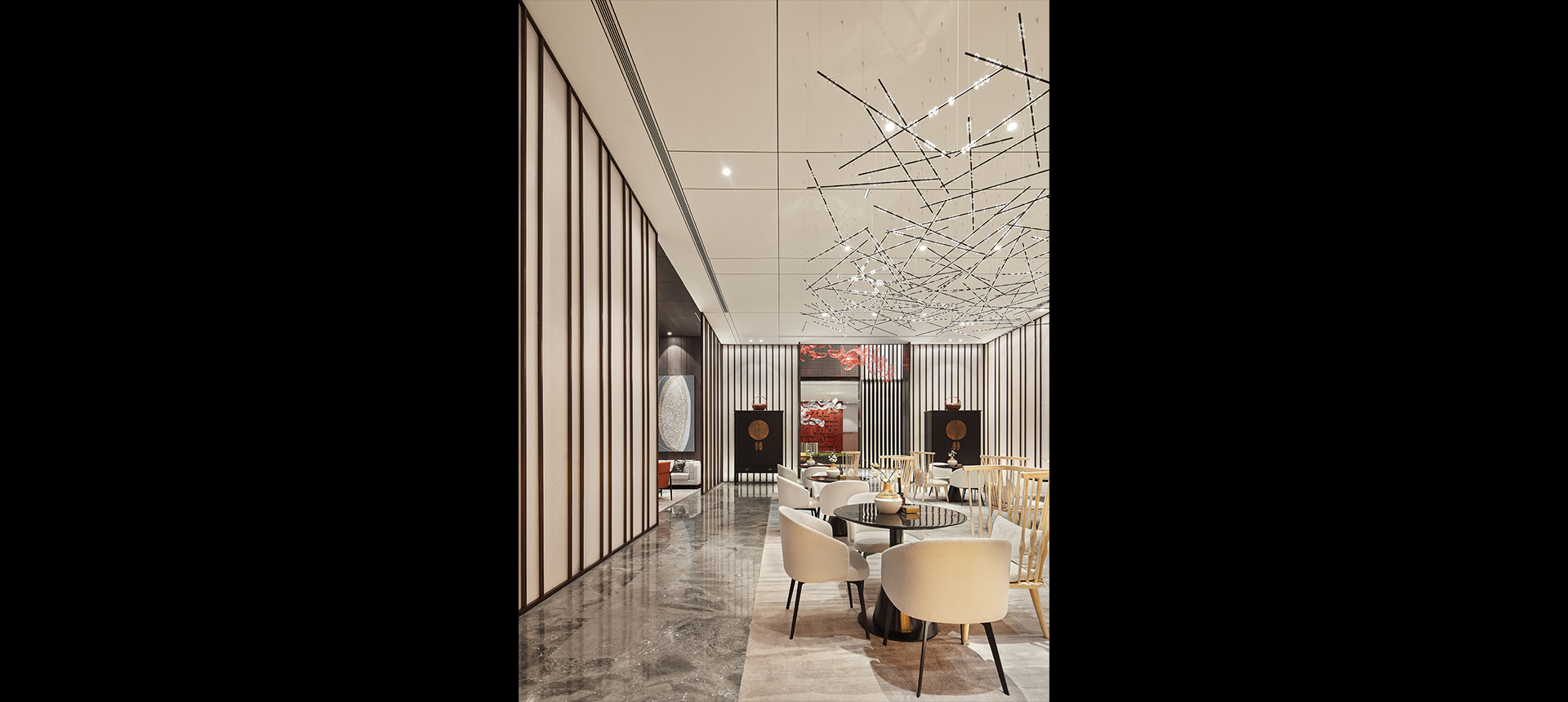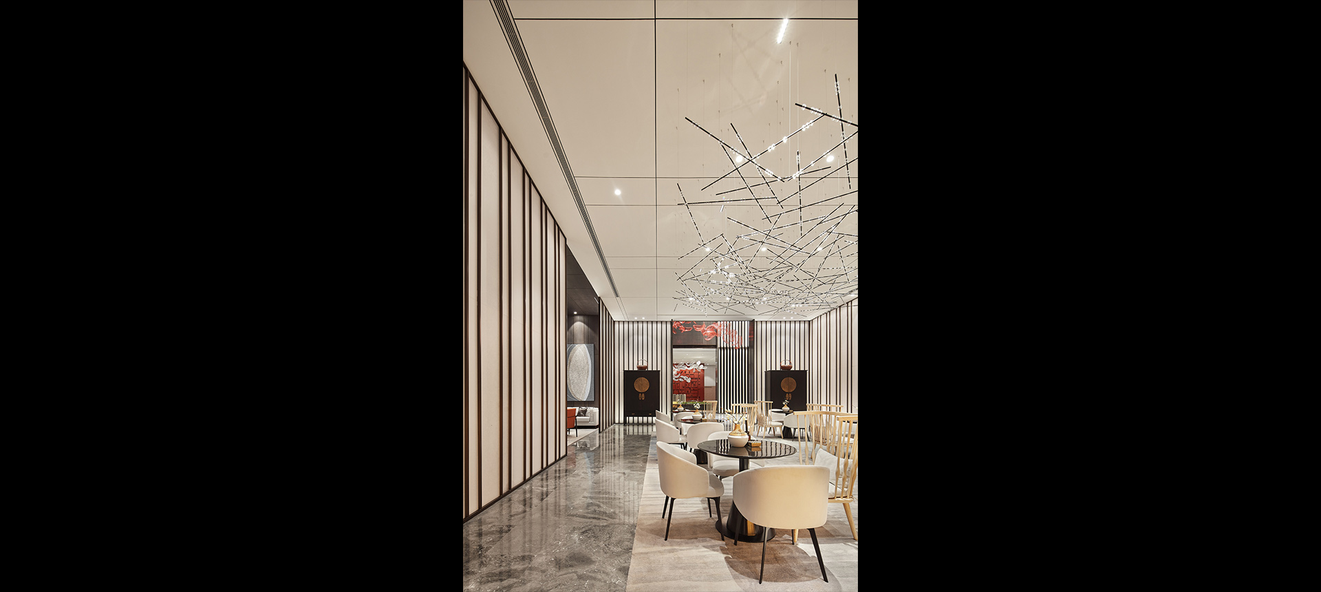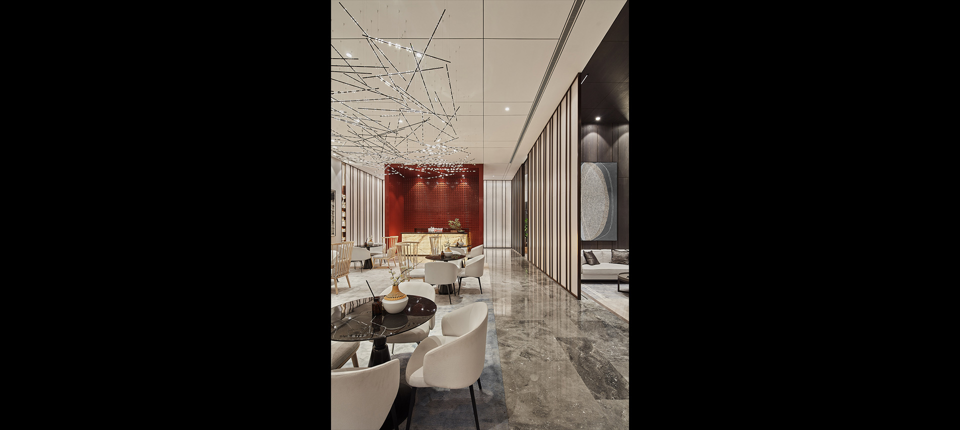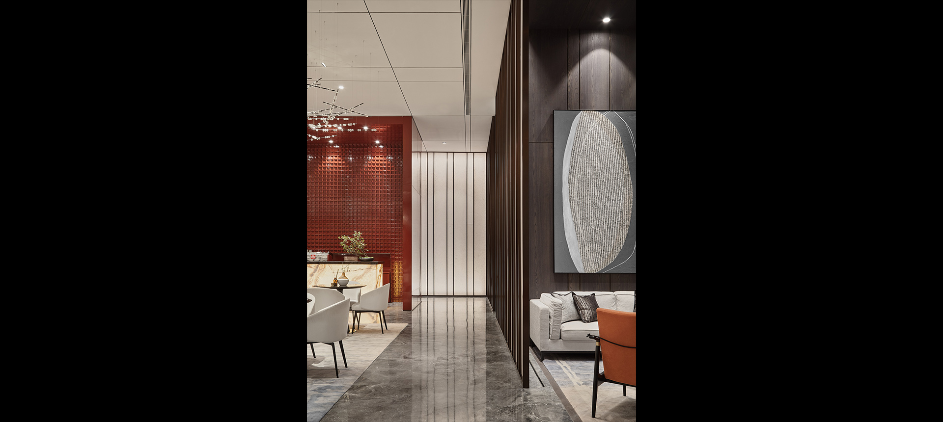 在营销中心的设计过程中,李益中空间设计尝试将惠州的山水自然和当地人文,通过设计手法的转译和表现,去融合现代的简与艺术的雅,力图使整个作品的光影、材质、意境革新,从而塑造出“俊逸灵动、润雅圆融”的气质。