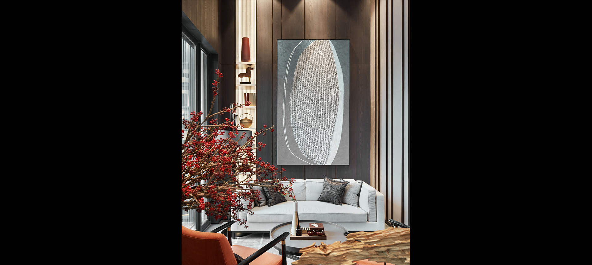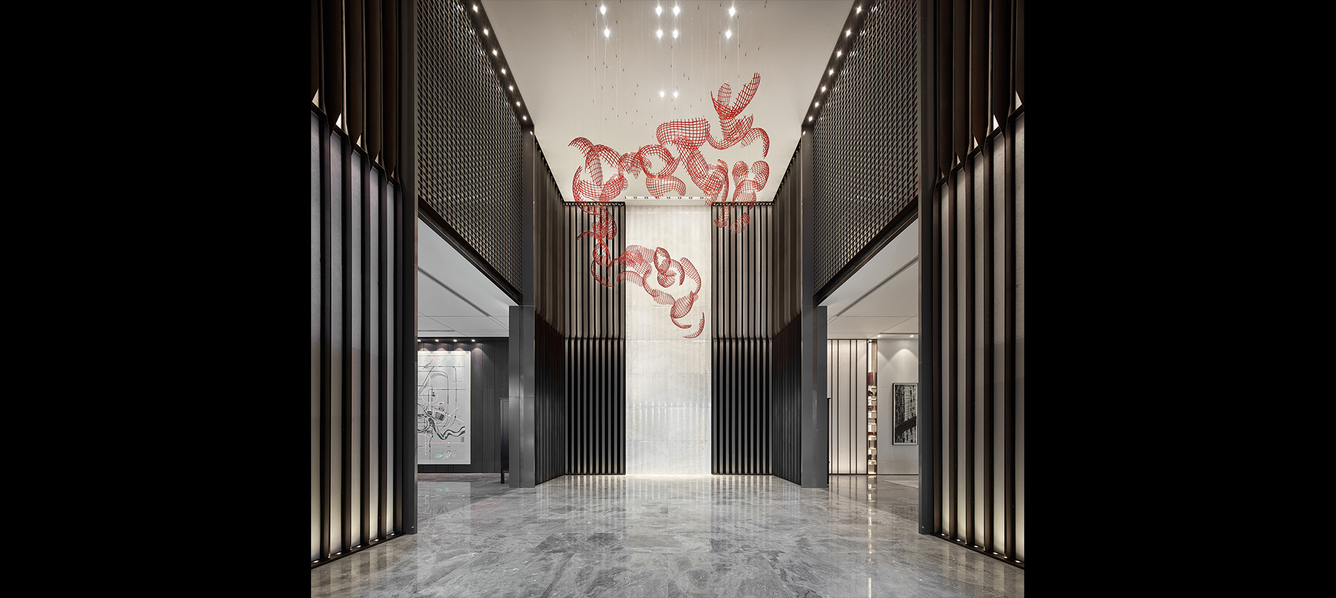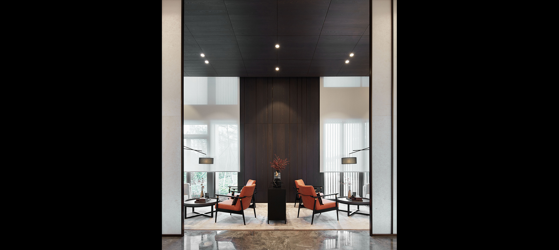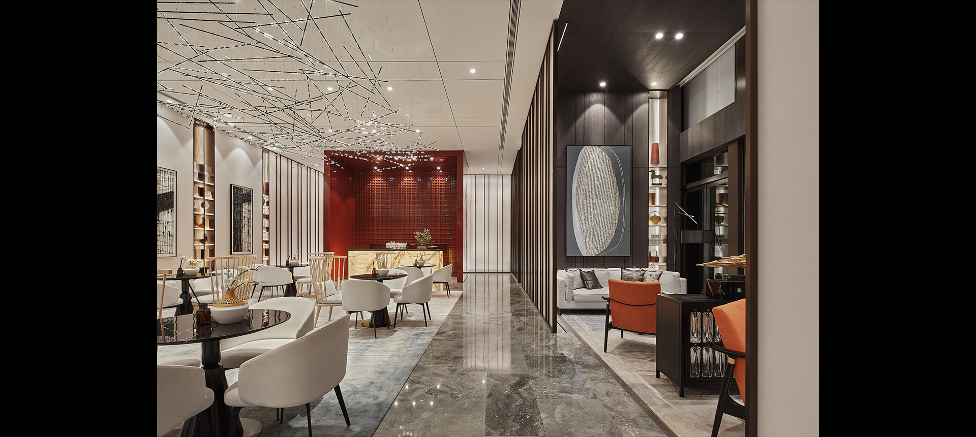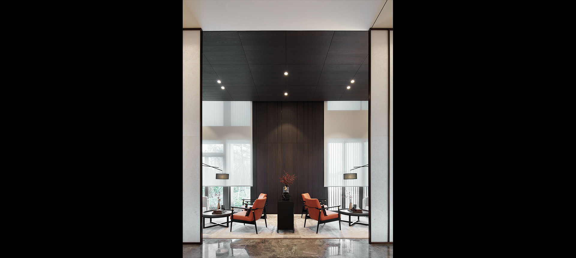 在营销中心的设计过程中,李益中空间设计尝试将惠州的山水自然和当地人文,通过设计手法的转译和表现,去融合现代的简与艺术的雅,力图使整个作品的光影、材质、意境革新,从而塑造出“俊逸灵动、润雅圆融”的气质。