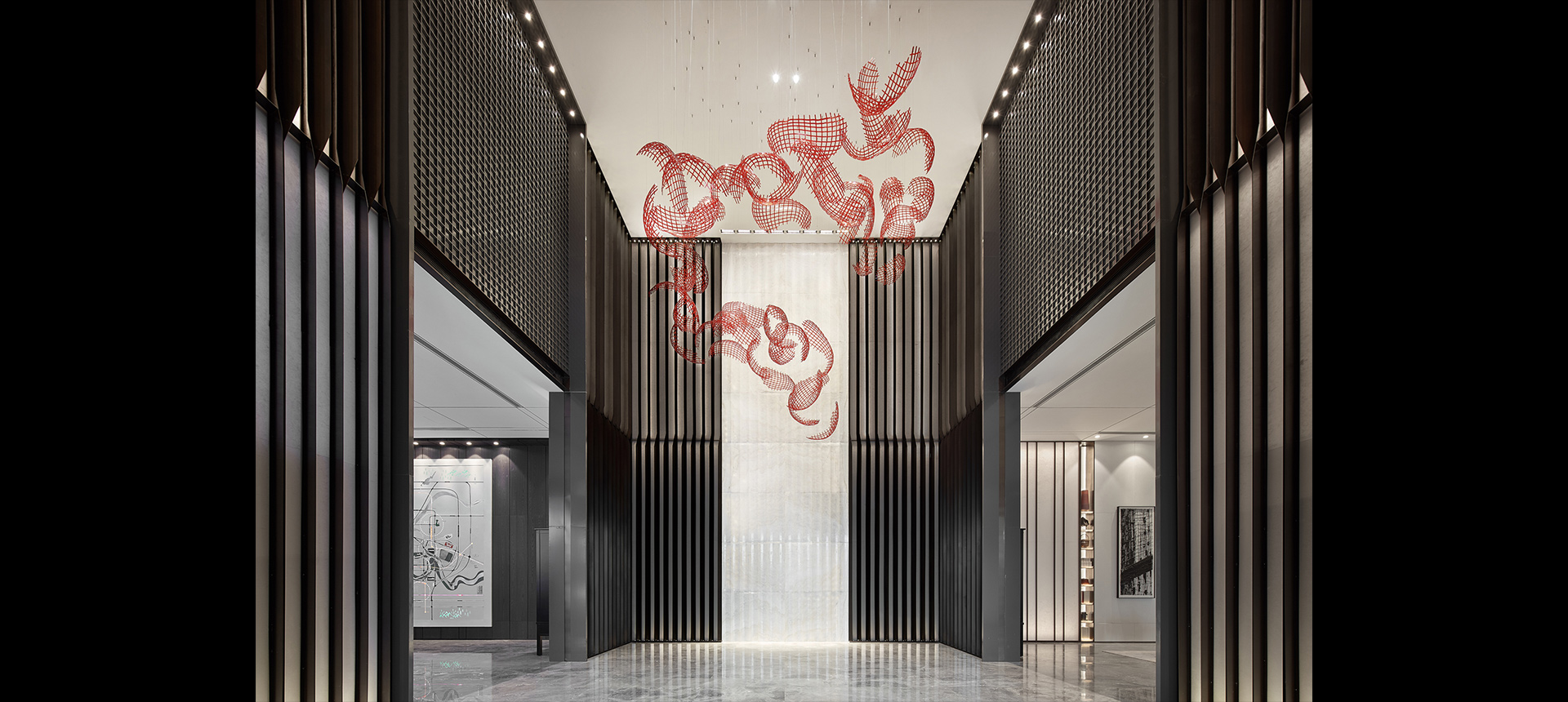 惠州非物质文化遗产—龙门林村盒箩制作工艺,亦是本案设计灵感的主要来源,设计师提取了对盒箩的编制印象展现于室内,如悬于半空的装置品,是采取具有现代感的透明亚克力材质利用热弯工艺制造而成,形似盒箩编制物品,用设计语言重温这份有温度的传统手工技艺。