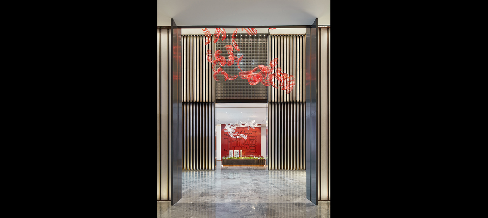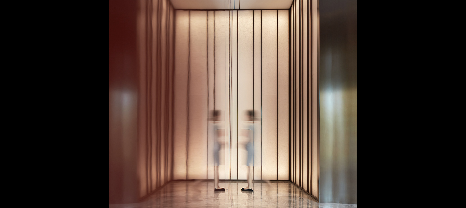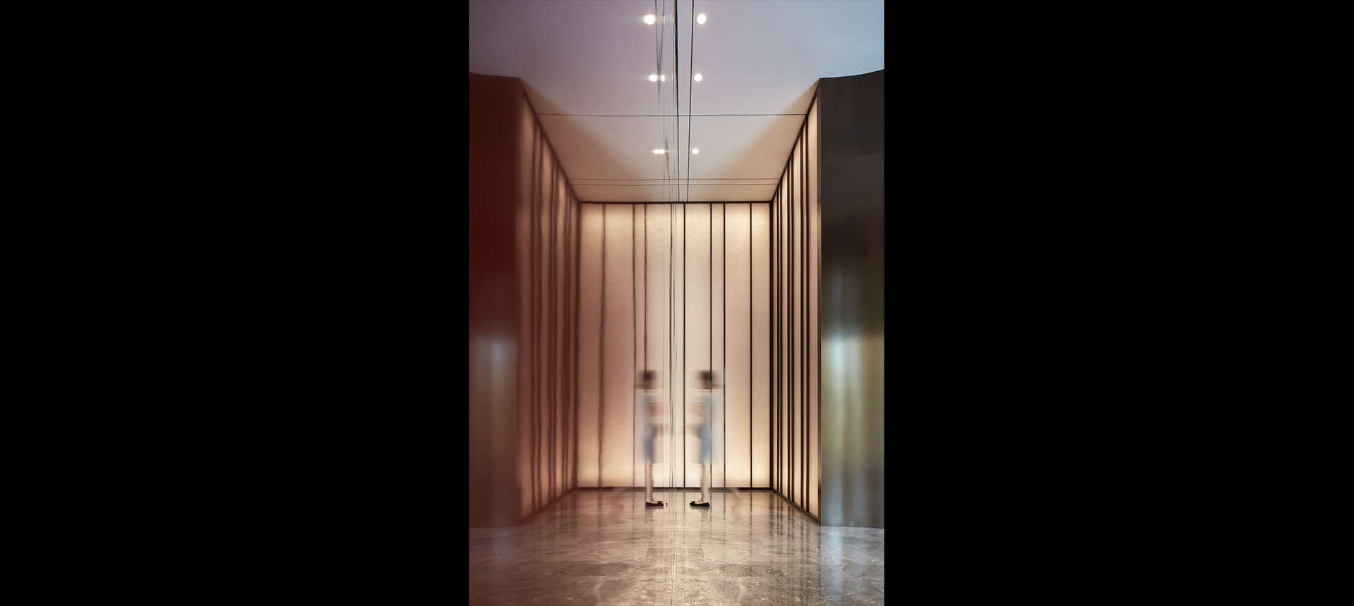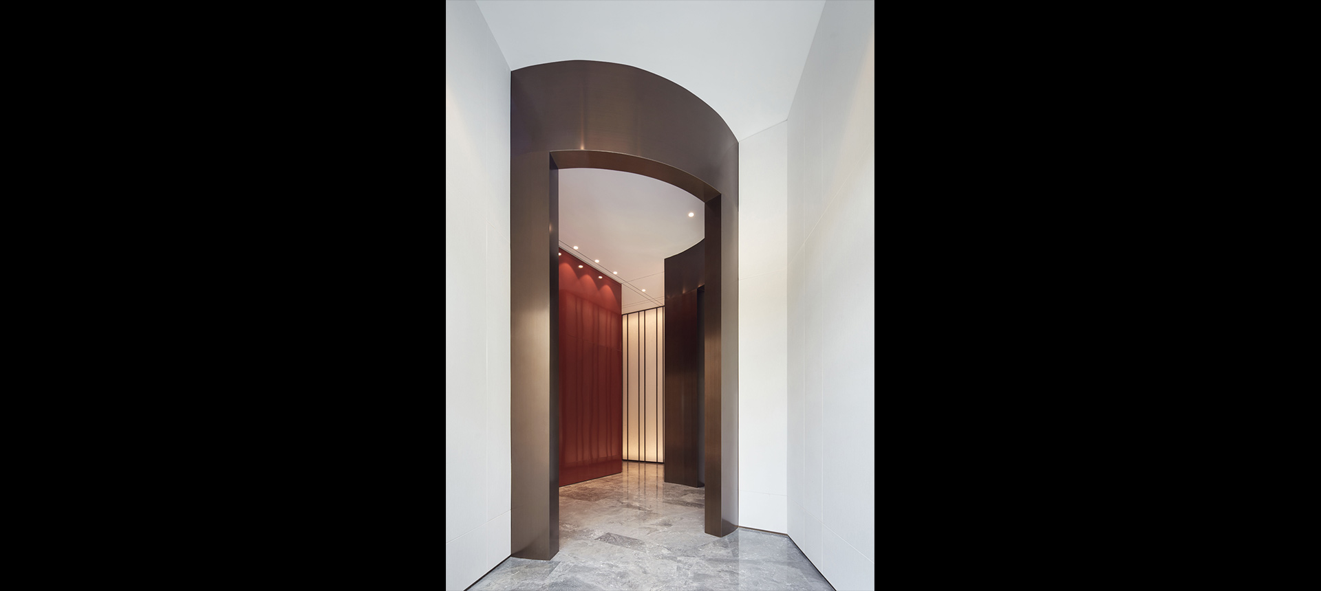 通往室外的过厅,用拉丝古铜塑造了一个简洁的半弧形框架,内部同样通过透光材料搭配情景光源,影响其透光率的变化,产生远近不同层次的光影效果。