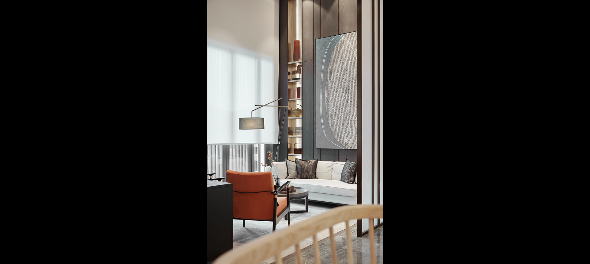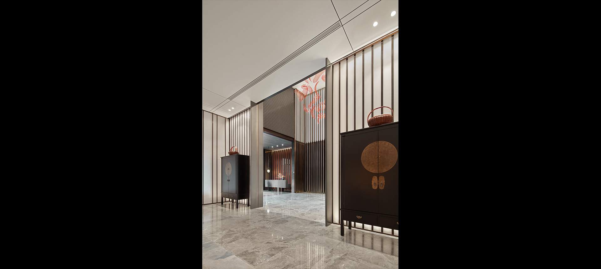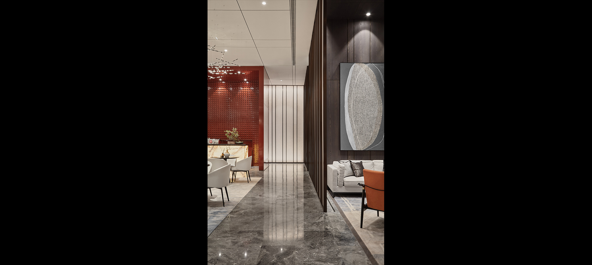 与接待厅形成鲜明的明暗对比的艺术过厅,使人们进入后,有豁然开朗之感。古铜钢和透光材质交织而成的墙面,阴阳相生一气呵成,呈现出尊贵府邸的不凡气度。