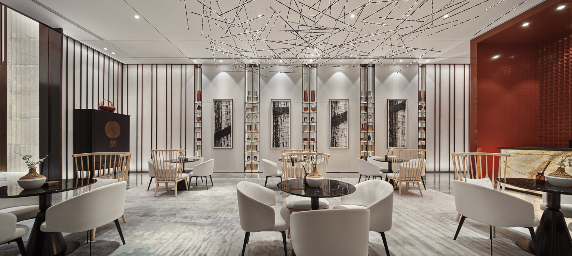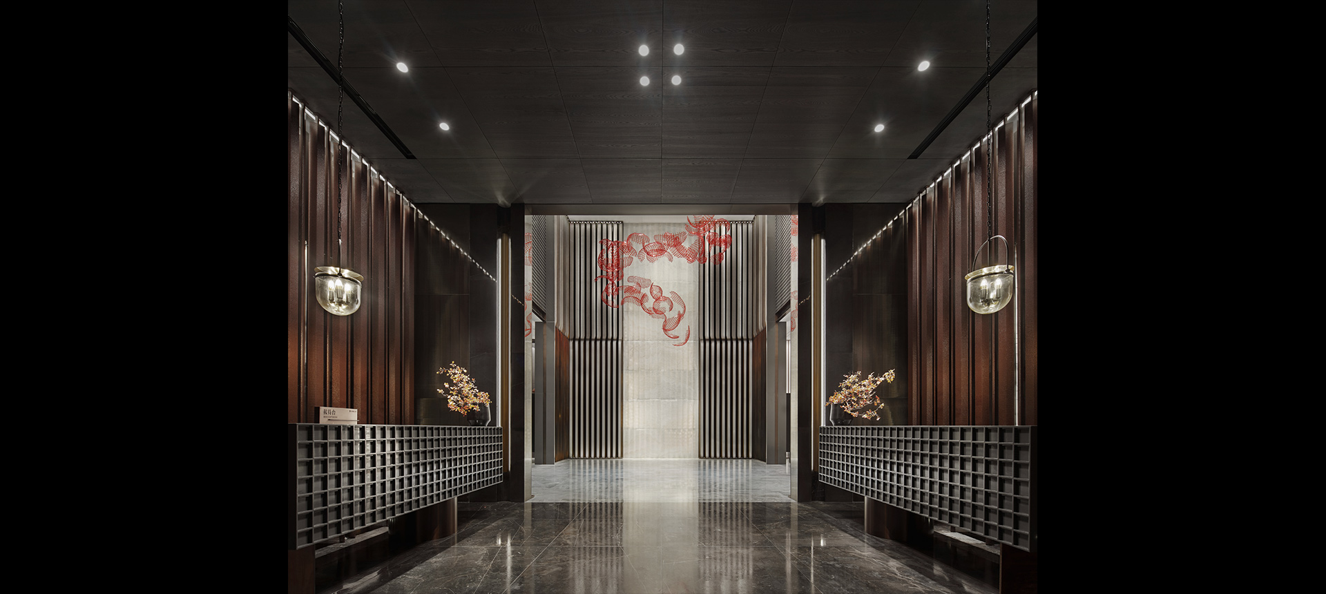 接待厅以深色的基调渲染静谧内敛的空间氛围,一片片手敲红铜交错铺陈光影斑驳,勾勒出意匠的气韵。