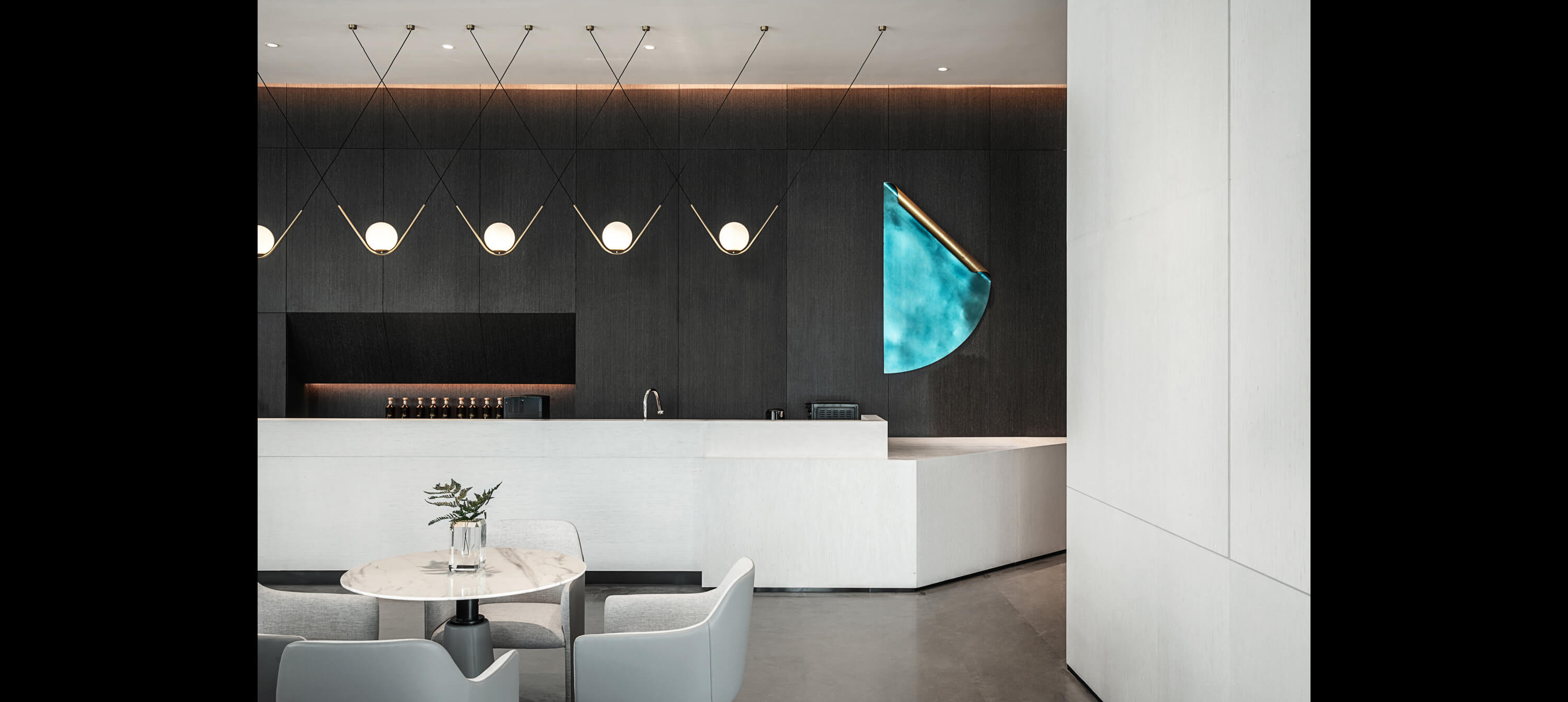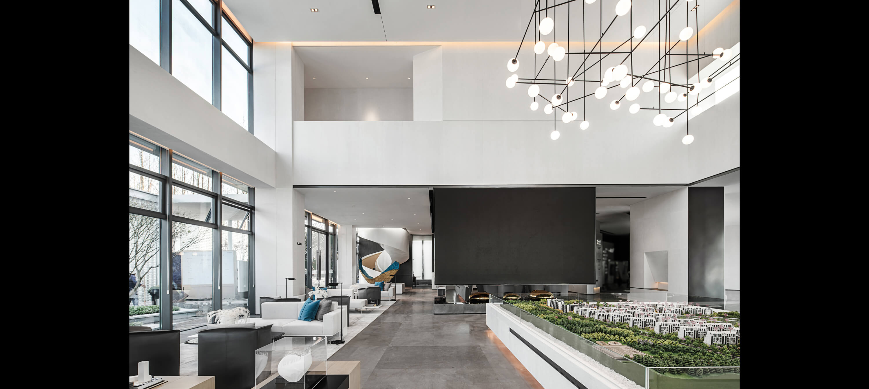 沙盘区背景墙黑色的几何体块与上方的线型灯饰构成厚重与轻盈的对比。