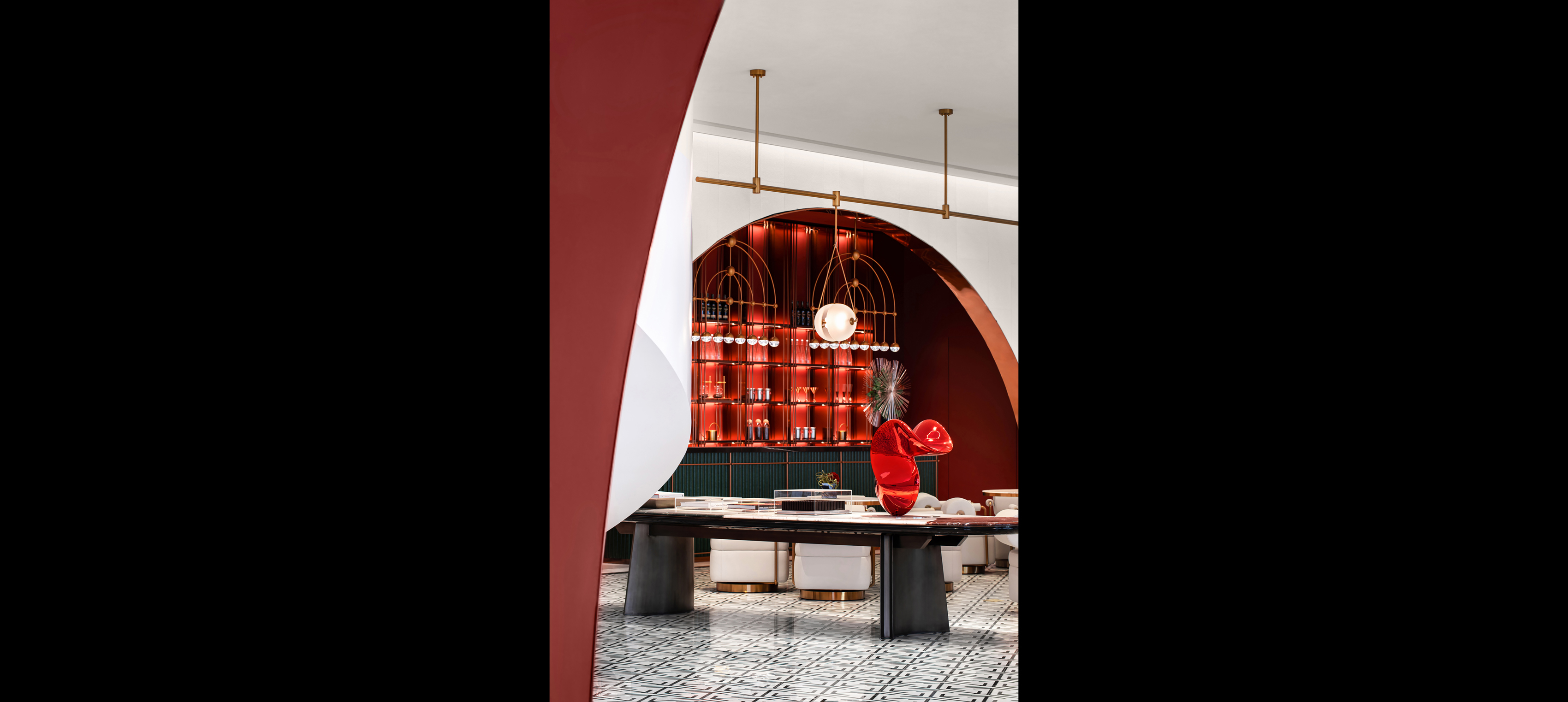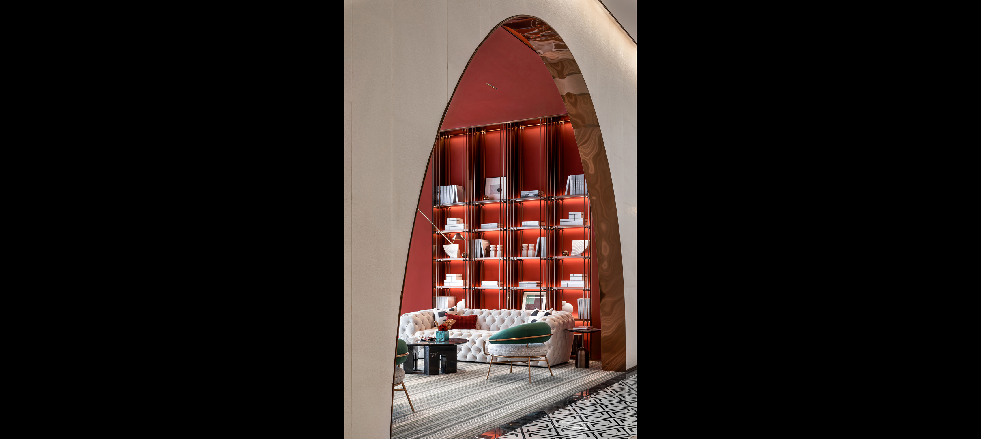 透过半月形的拱门探至水吧,红绿二色的碰撞在空间中形成了别致的韵脚,以一种源于色彩、肌理、材质的外在表现形式,为人们带来当代美学的创新视觉体验。朦胧的光漫映其间,气质悠然而淡雅。