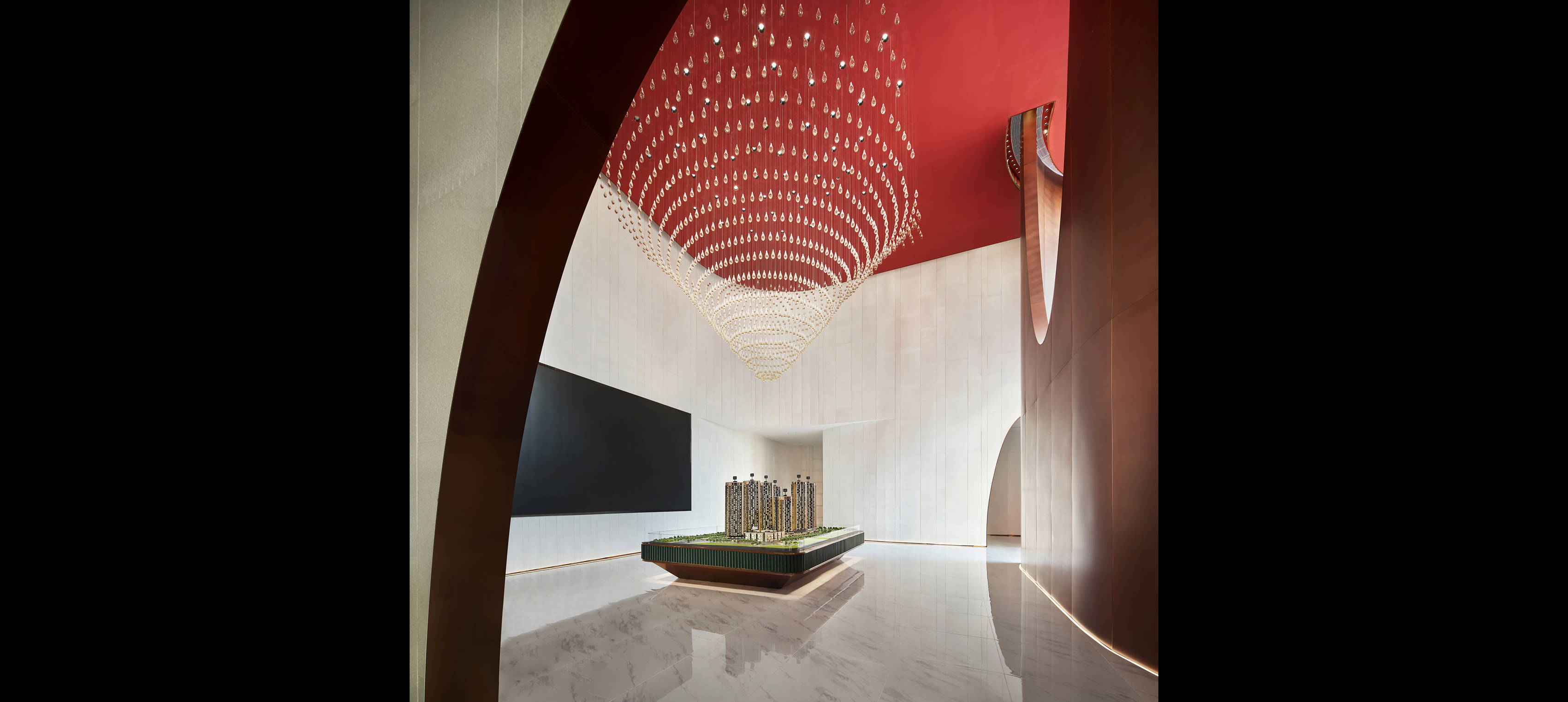 大小、形制不一的弧线拱门,延续了视觉上的艺术纵深感,串接起沙盘区与各功能区的关联点。在细节上,设计师以有趣的色彩、简约的形制、精致的灯饰点缀空间,烘托出润雅圆融的艺术气息。