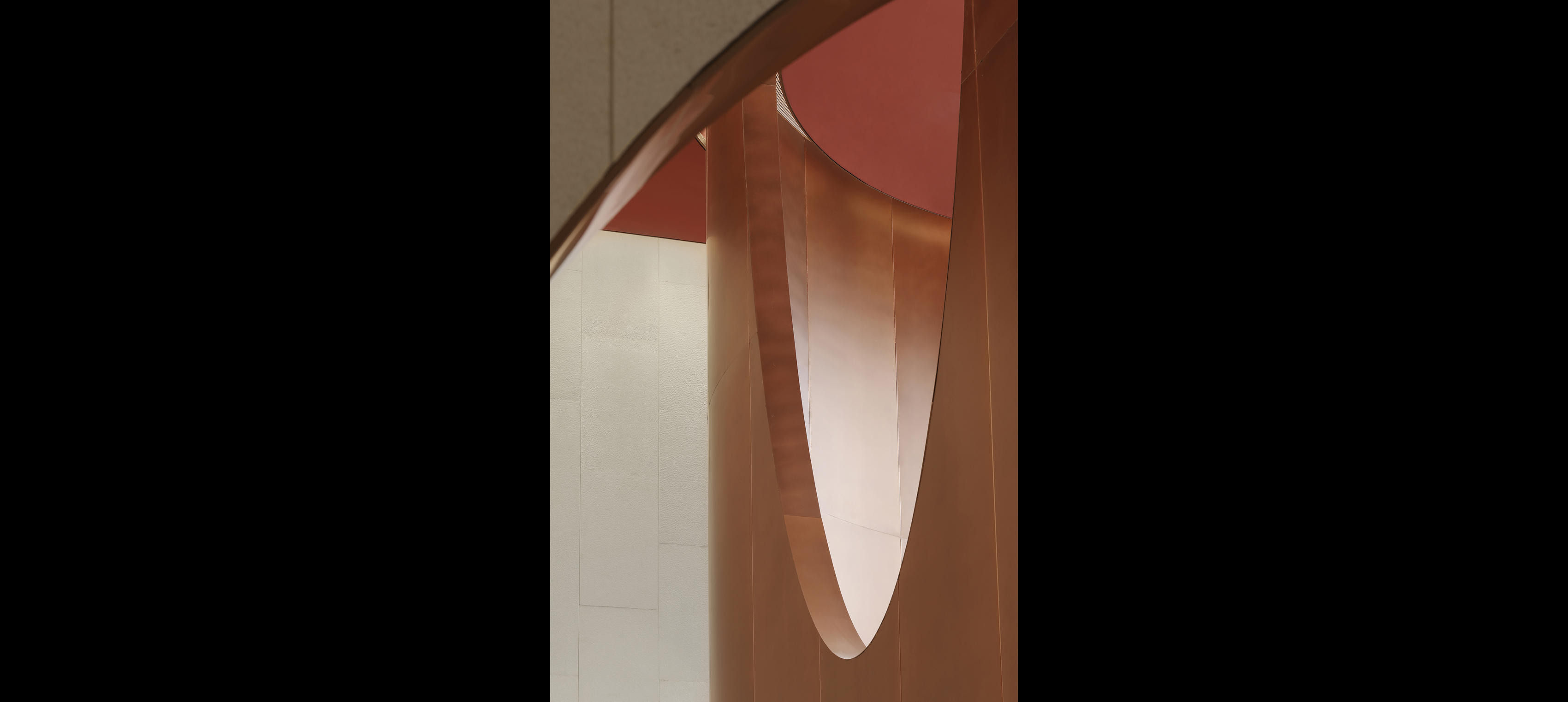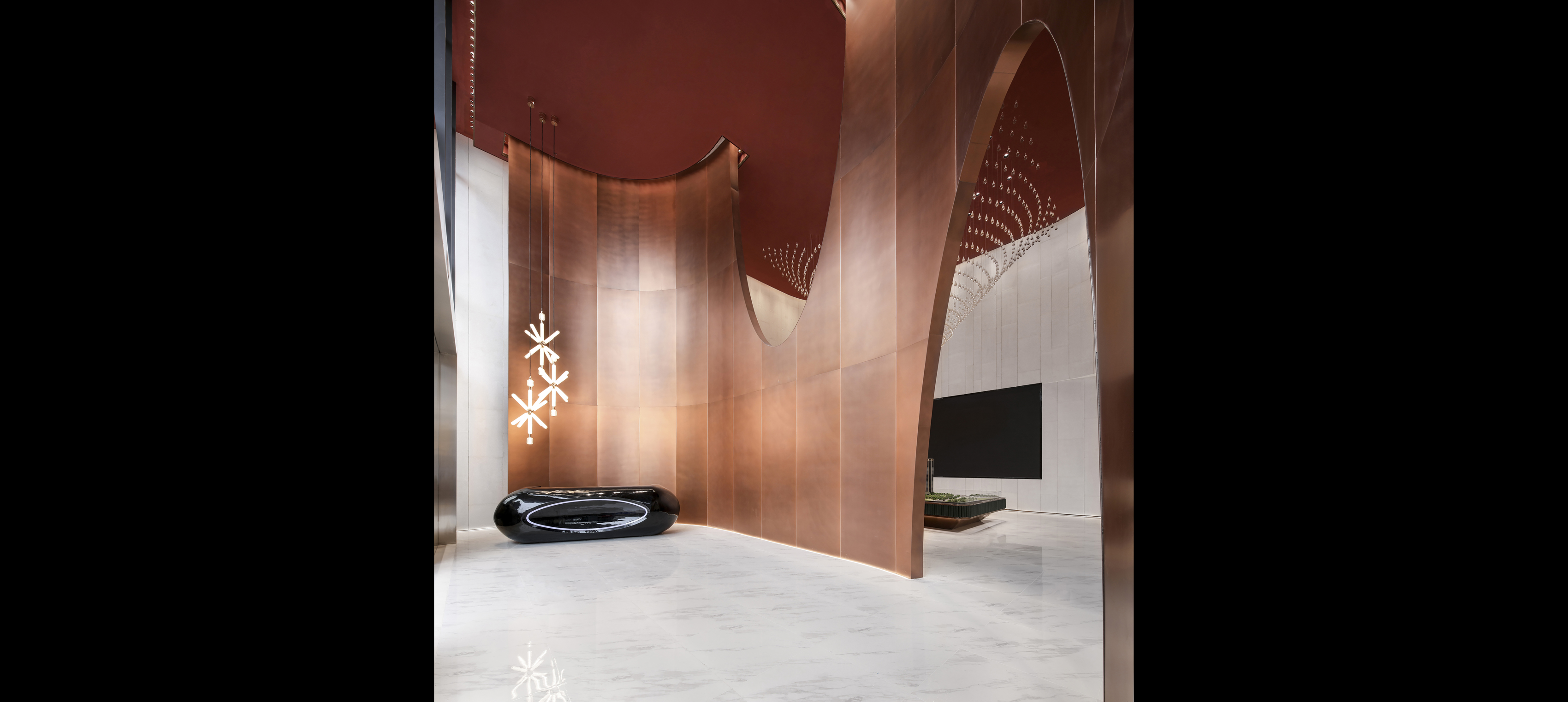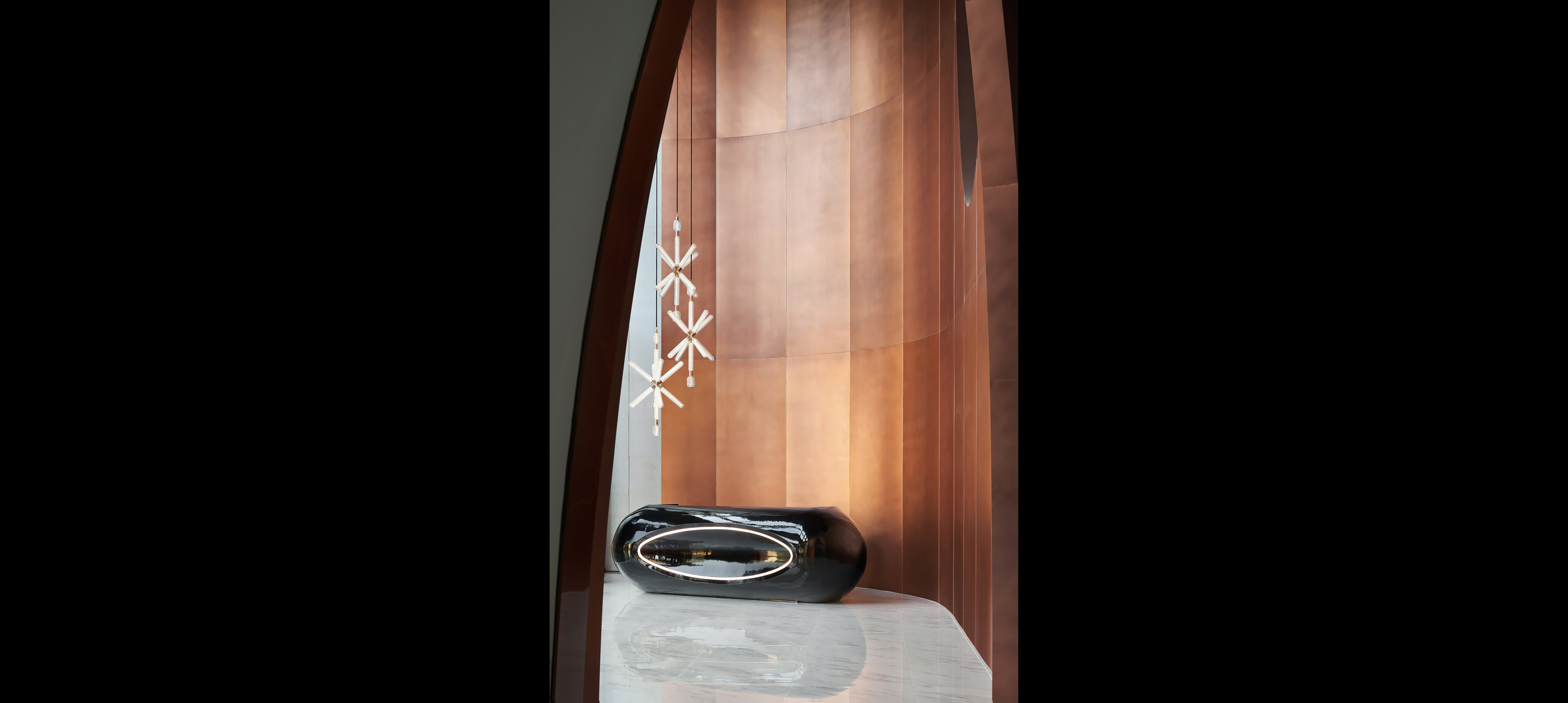 在空间的入口处,设计师运用流动形态的曲面代替了以往的直线型体块,以铜板材质呈现,增添了空间的现代时尚气息。整体设计上,以浅色调的大轮廓,包裹着色彩浓郁的小空间,在弧线艺术的延展下,赋予其俊逸灵动的层序美。