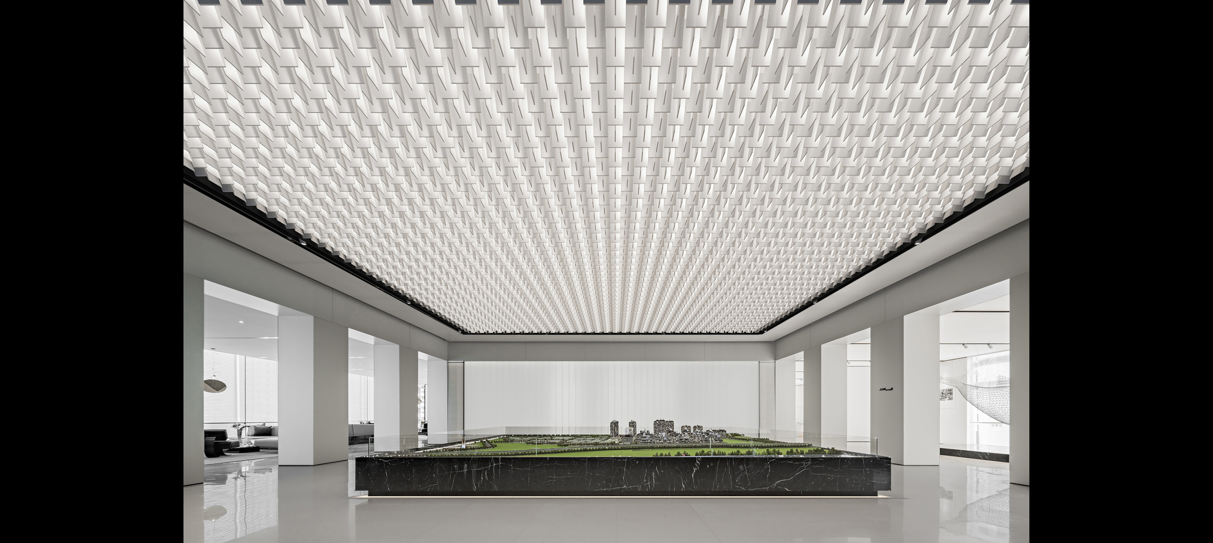 中部空间的沙盘区受自然光的照顾逐渐削弱,为了延续整体的光感,沙盘区设计了一个巨型天花灯饰,璀璨的灯饰与下方方正的沙盘构建起壮阔与大气,震撼的造型给这个区域带来强烈的展示感受。