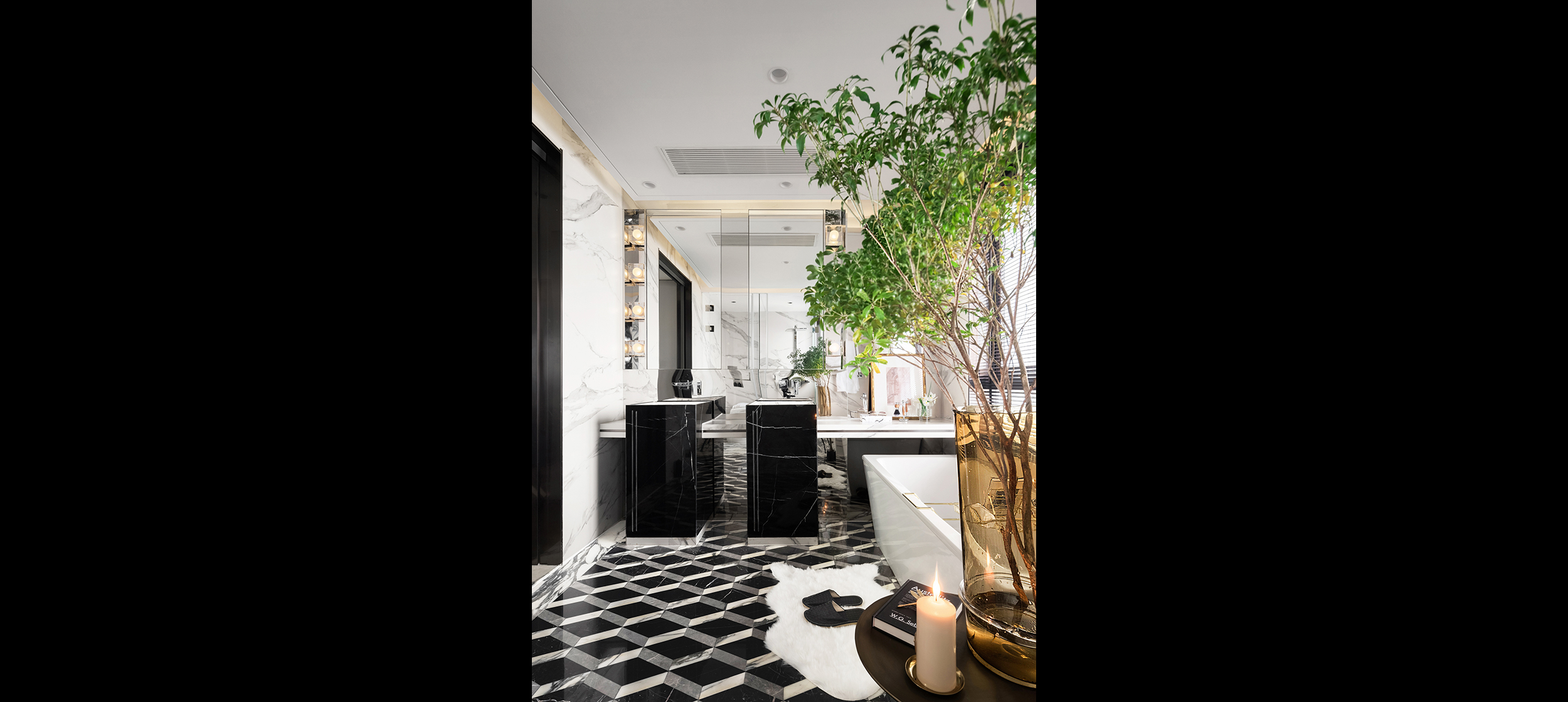 于是,主卧的边界得以延展出一个敞阔的私享卫浴空间,现代感兼备,细节上处处用心,以拼花地板与灯饰营造出浓浓的复古质感。