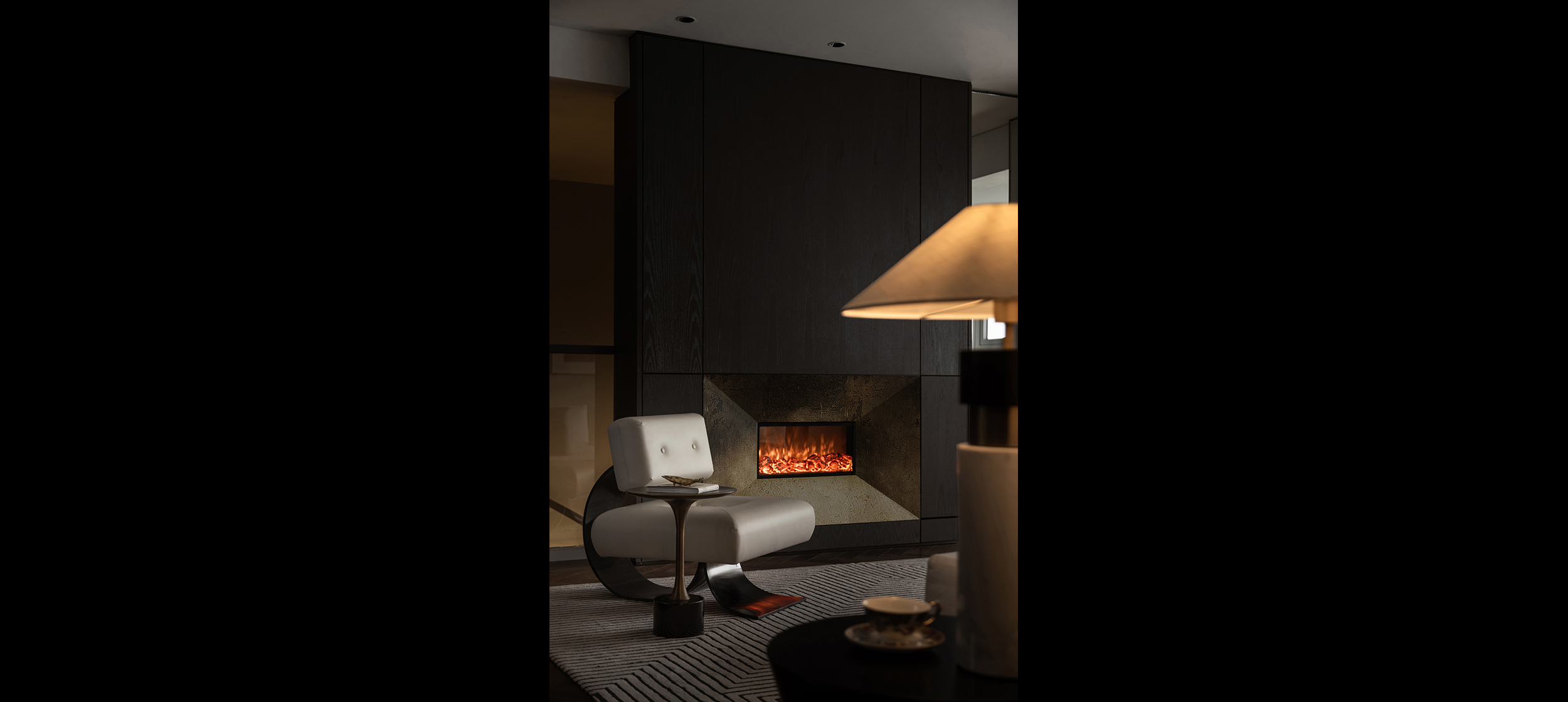 木饰面营造的舒适惬意之外,拉丝古铜、皮革、大理石也很好地点缀出了一种海派的精致感;体块鲜明的素色墙面兼顾了影视厅背景墙的功能,并以弧线切分嵌入一架壁炉,点染冬日的阵阵暖意。