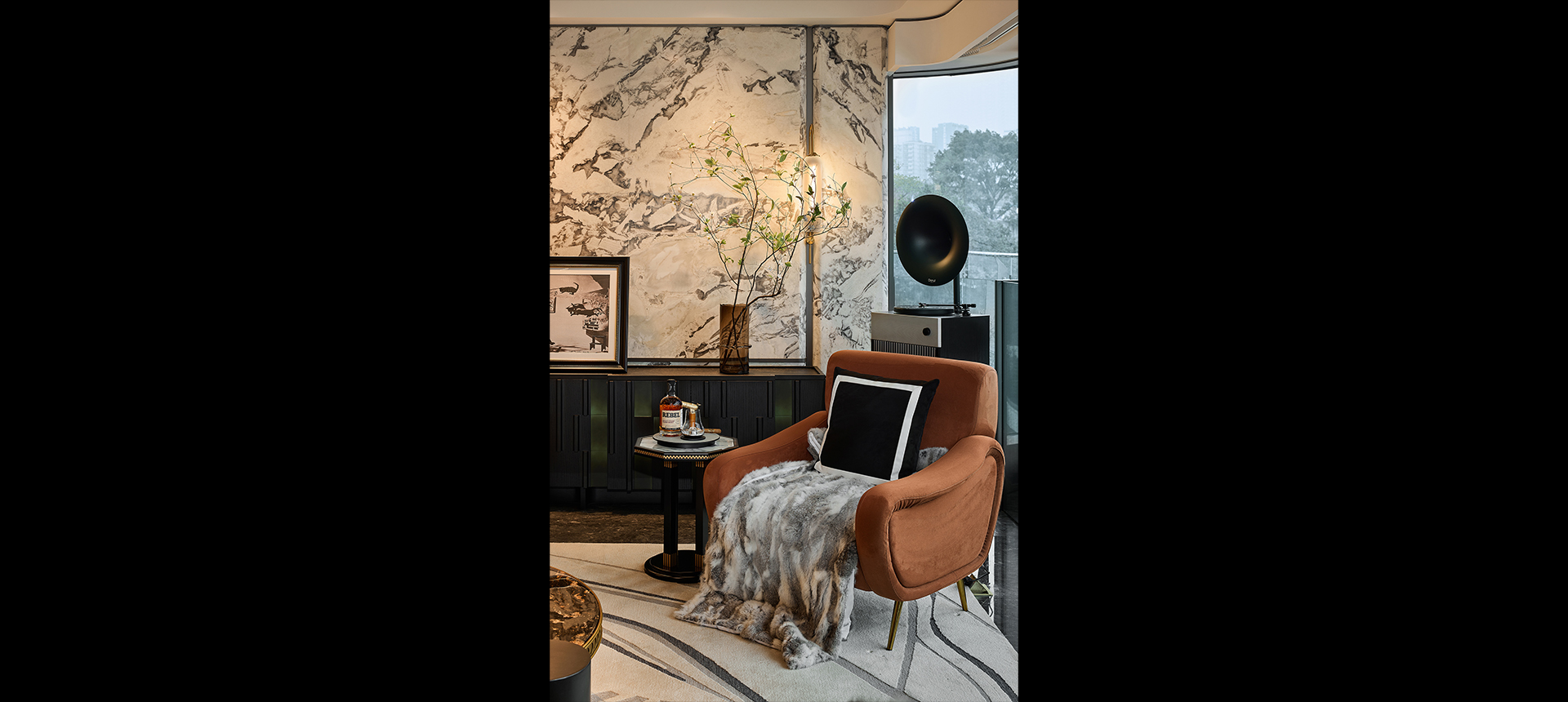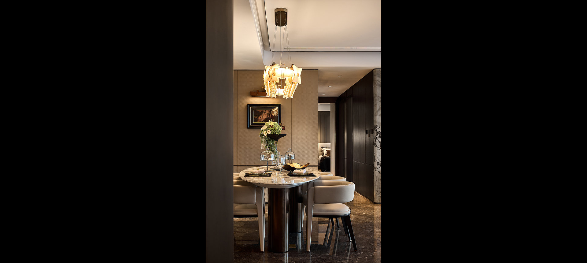 沙发、茶几、餐桌等主体家具皆是具有弧形的设计,饱满圆润的形体与臻选的品质材料交织,体现出设计对精致品质生活的追求,空间美学的探索。