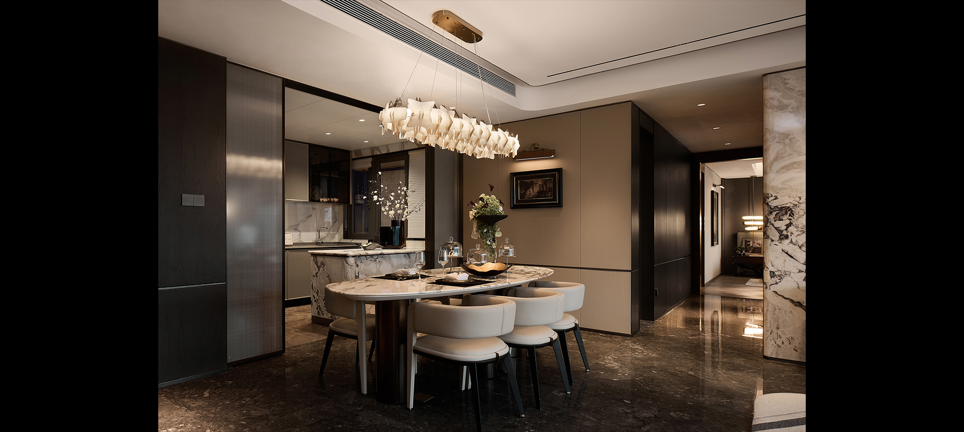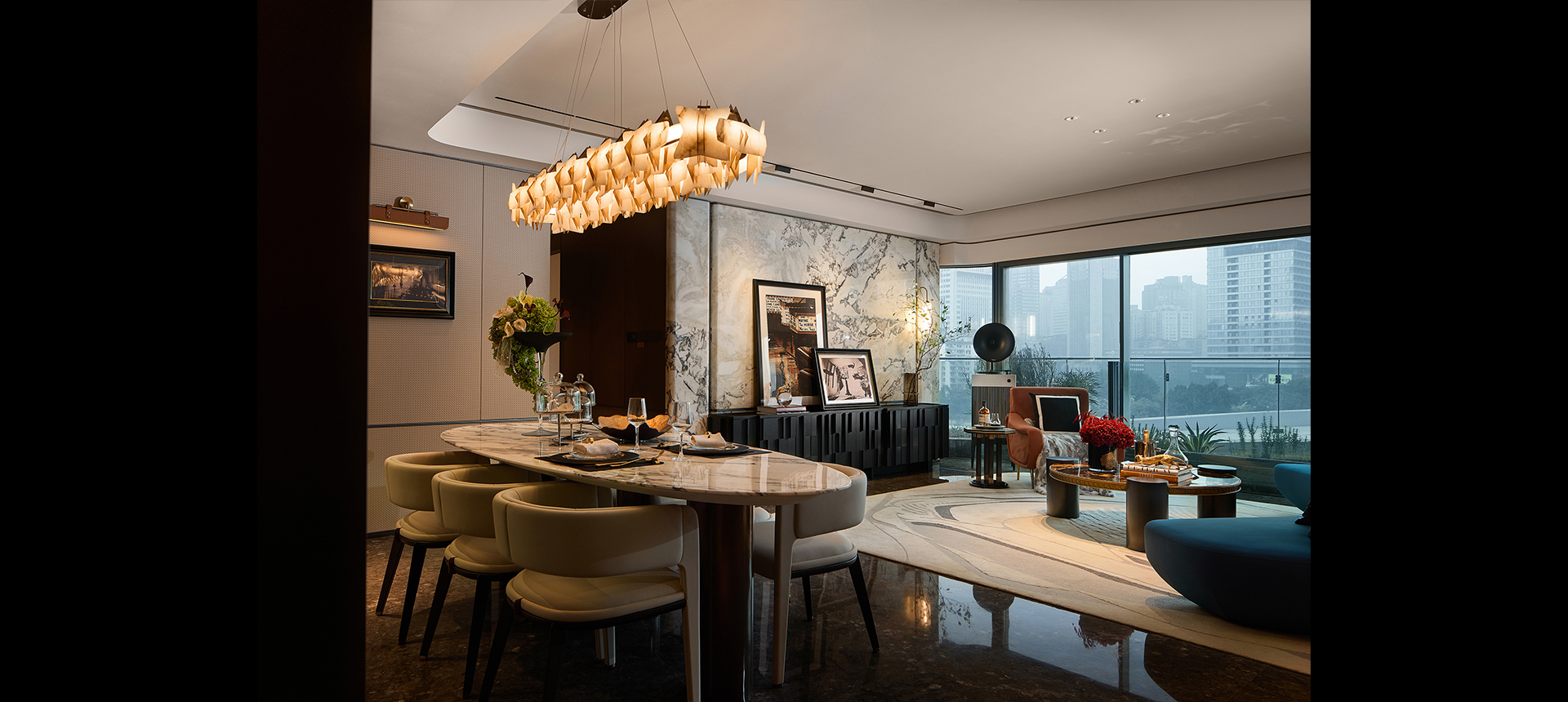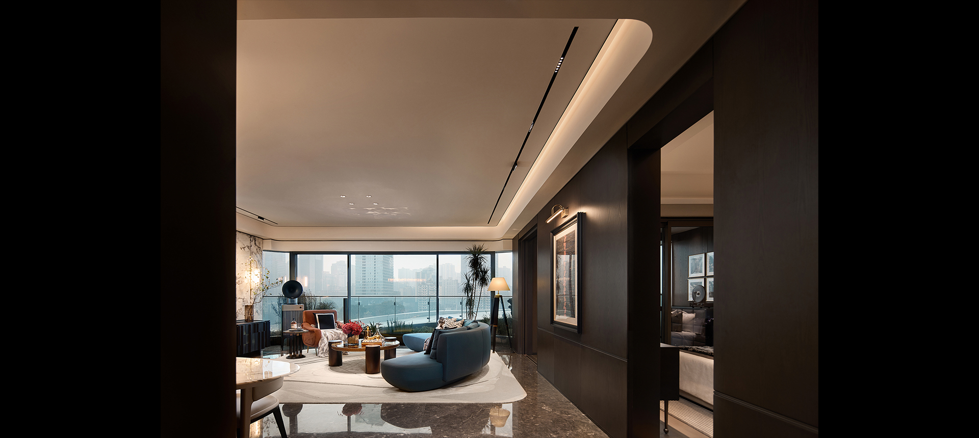 设计由内而外,从空间到精神、从视觉艺术到生活美学的多面组织,树立重庆的高端人居作品。设计者对空间的组织方式,对材质色彩、灯光软饰等的组合,决定了空间的场景调性及予人的心理感受。