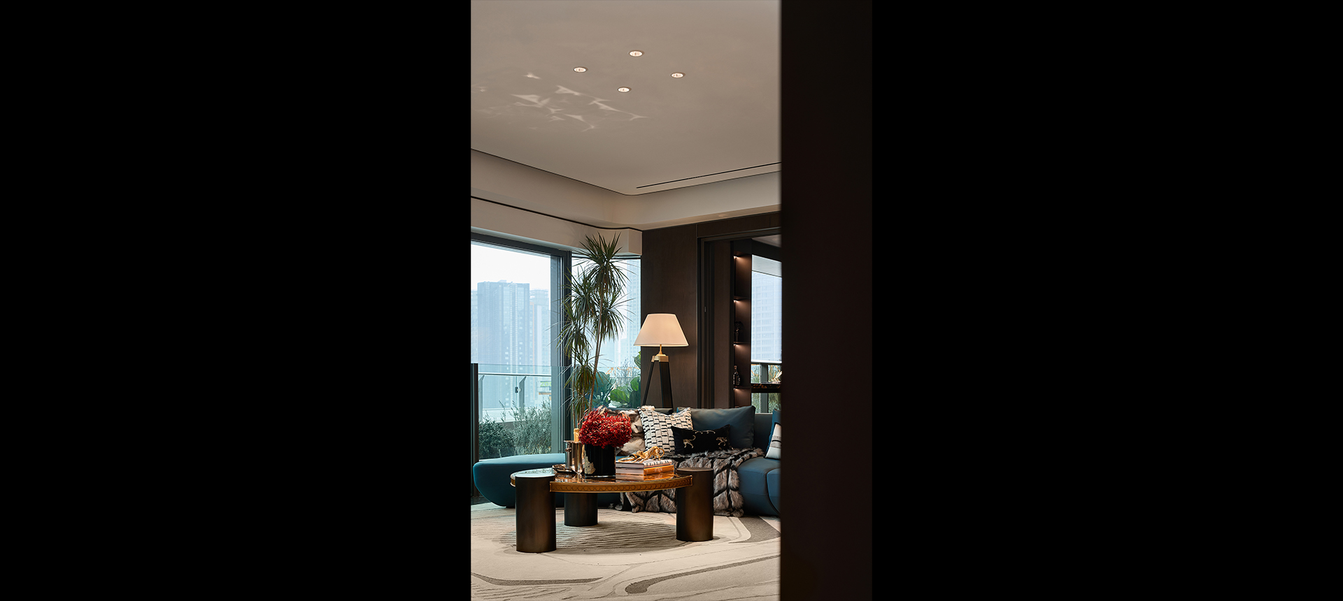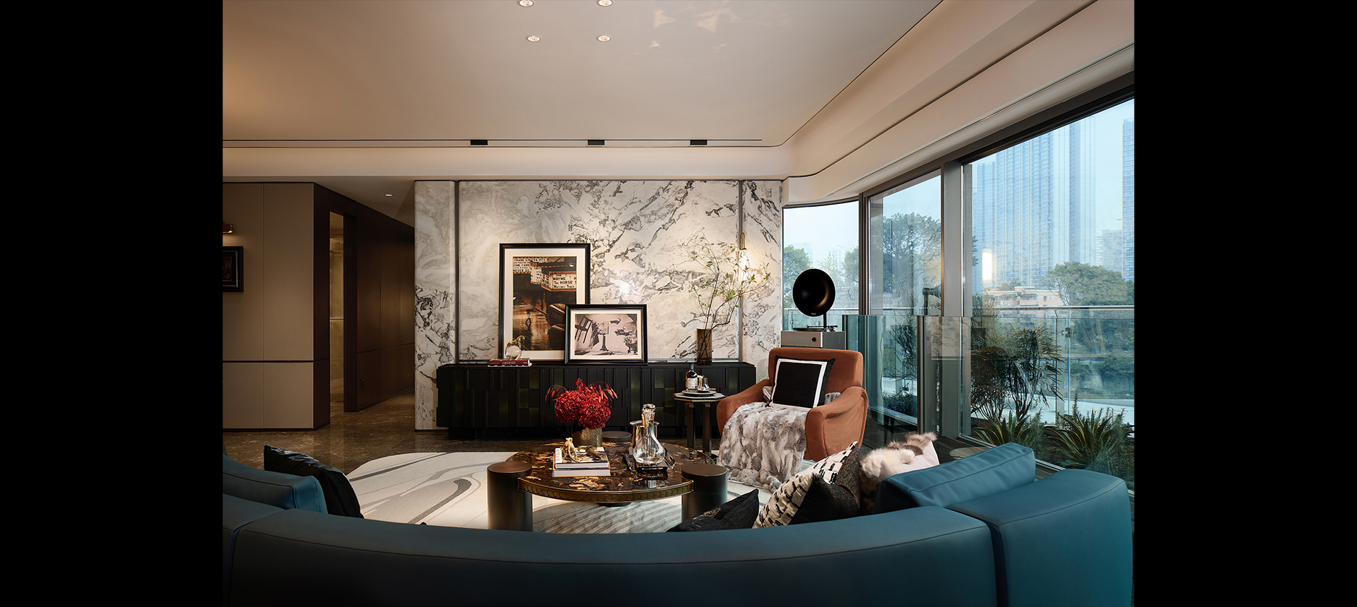 客厅超大面宽落地窗,拥有一线城景的全景视野,是最抢眼的取景框。无硬性分隔的全开放式大厅,令人感到通畅和明亮。