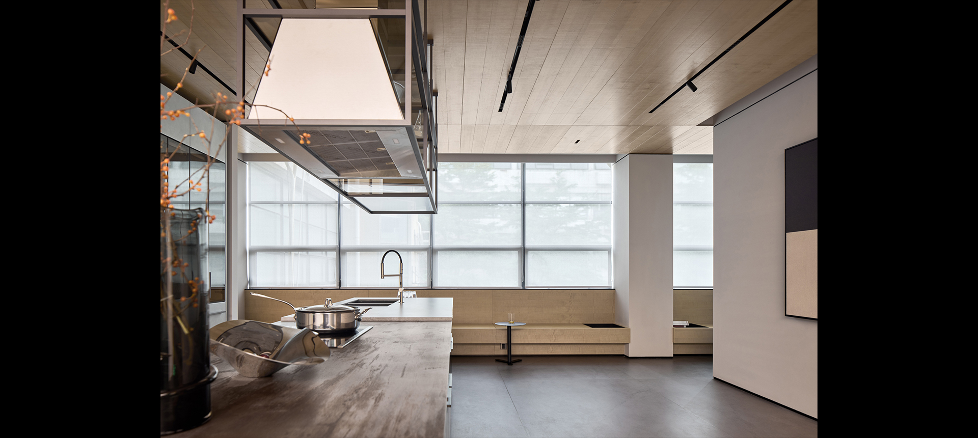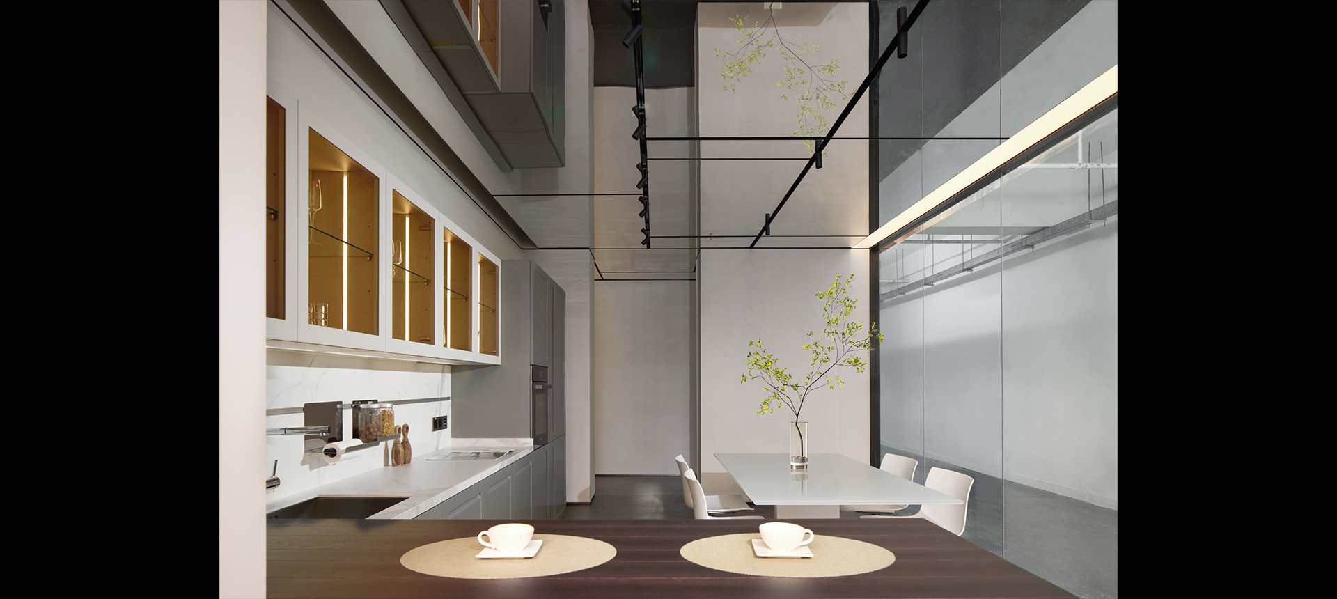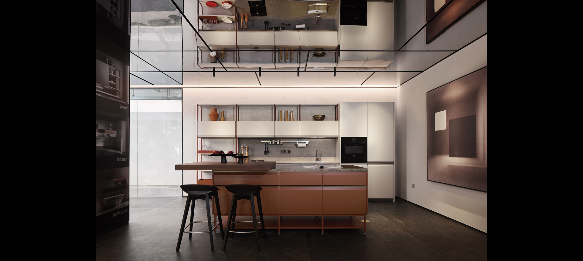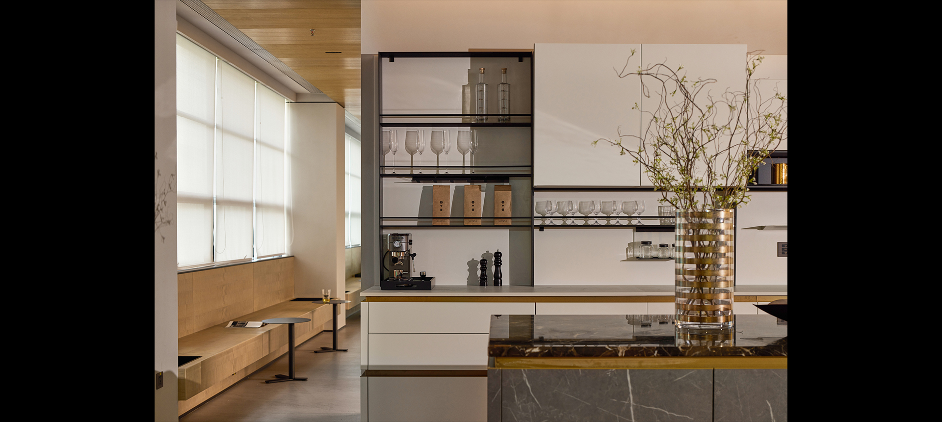意大利Scavolini(深圳)展厅在空间规划上,设计师将日常的办公场所与展厅部分用隐形玻璃门分隔,彼此相连但相对独立,空间动线分明,互不干扰,以保证展厅空间的创作自由与纯粹性。