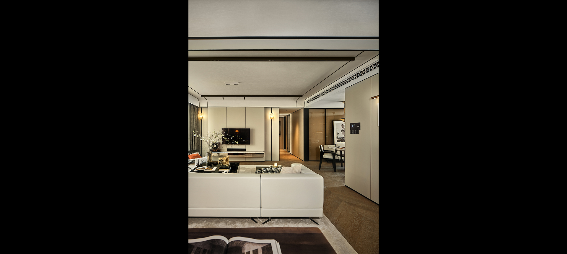 空间处理上,设计师以严谨的比例关系,运用皮革、墙布、木饰面等各种材质经常穿插组合,以有序的设计语言让整个客厅空间主次分明,节奏把握得当。