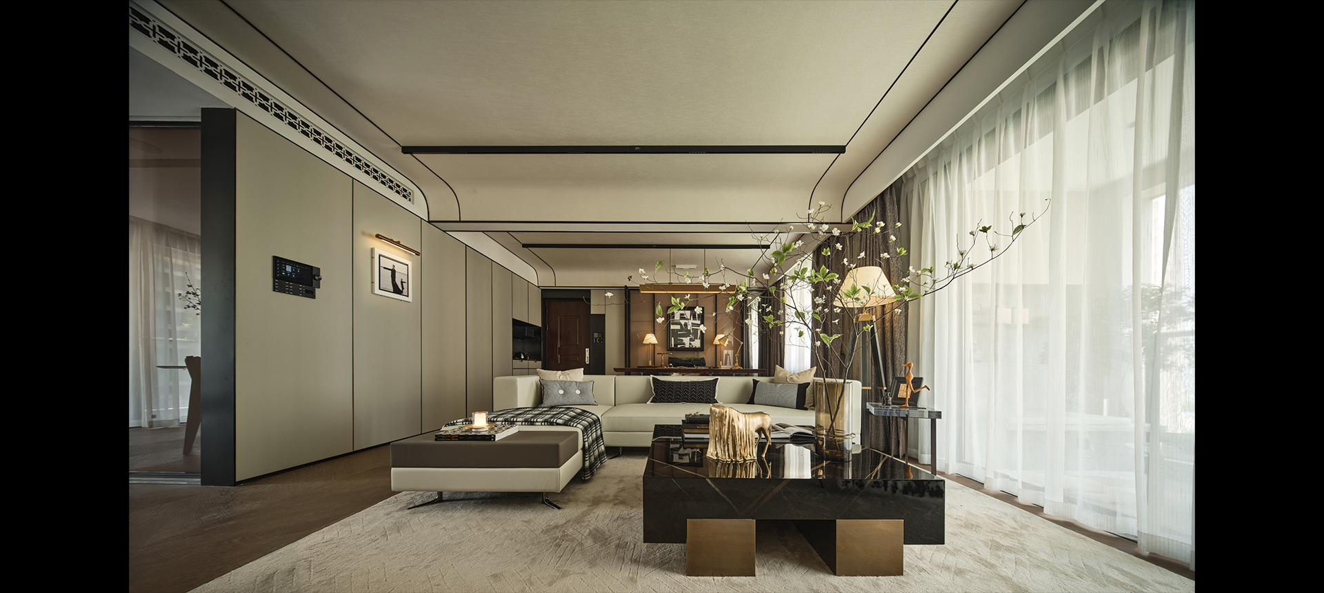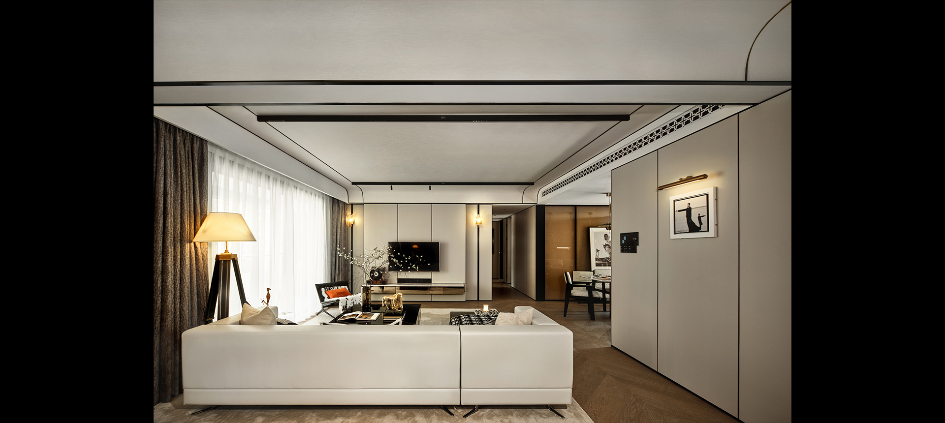 天花造型的灵感来源于潮汕的传统民居“四点金”建筑的屋脊,俗称“硬山顶”。天花设计以弧形收边,结合客厅的梁结构形成一个具有鲜明特色的造型。
