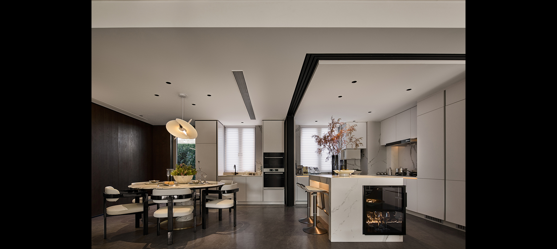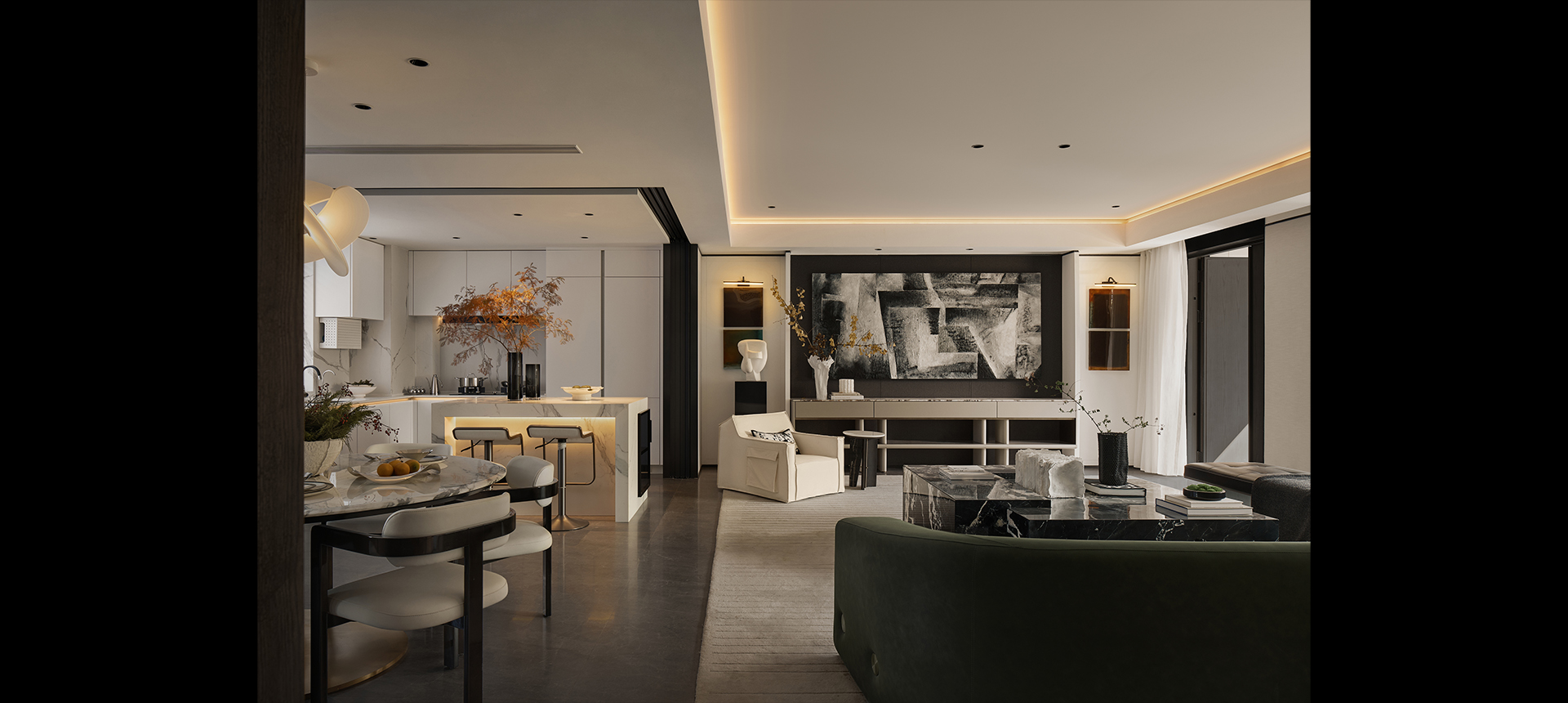 在家庭共享区要重视开放与互动,以开阔的格局和尺度去鼓励家人之间的交流。客餐厅的开放式相接,中西双厨的紧密相连,动线流畅,舒展自然。