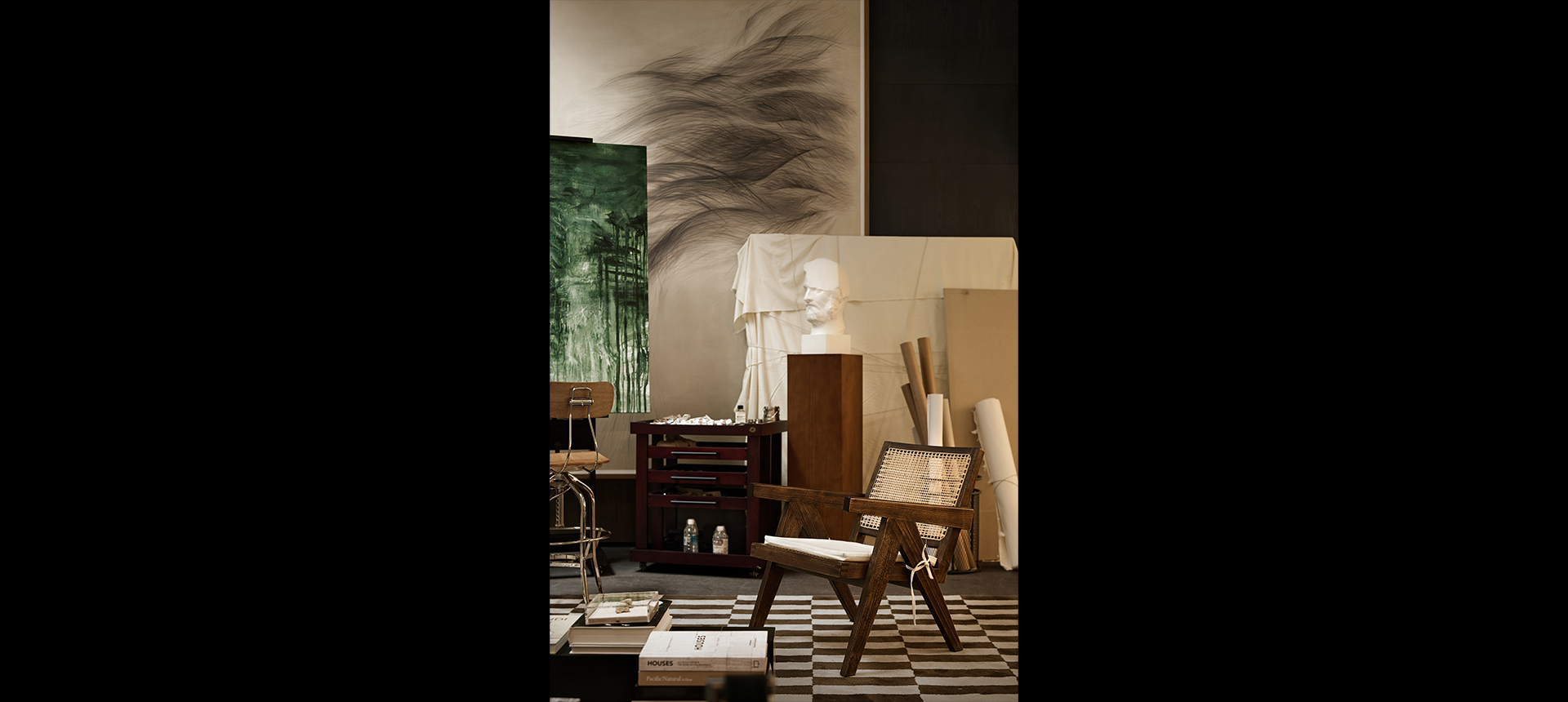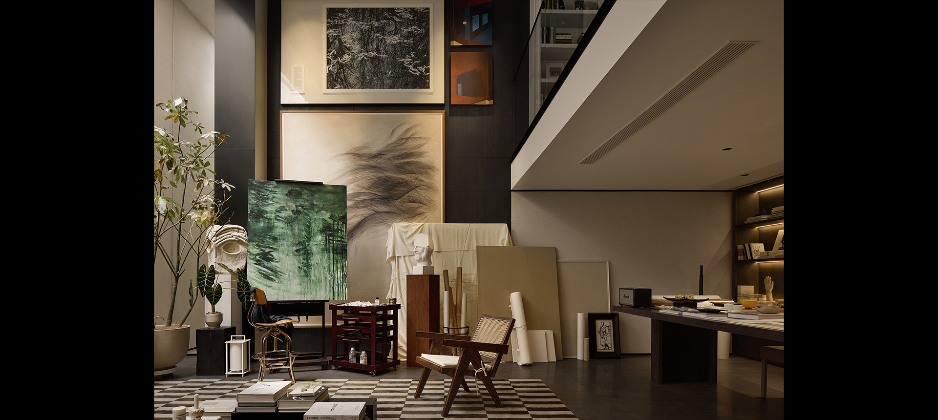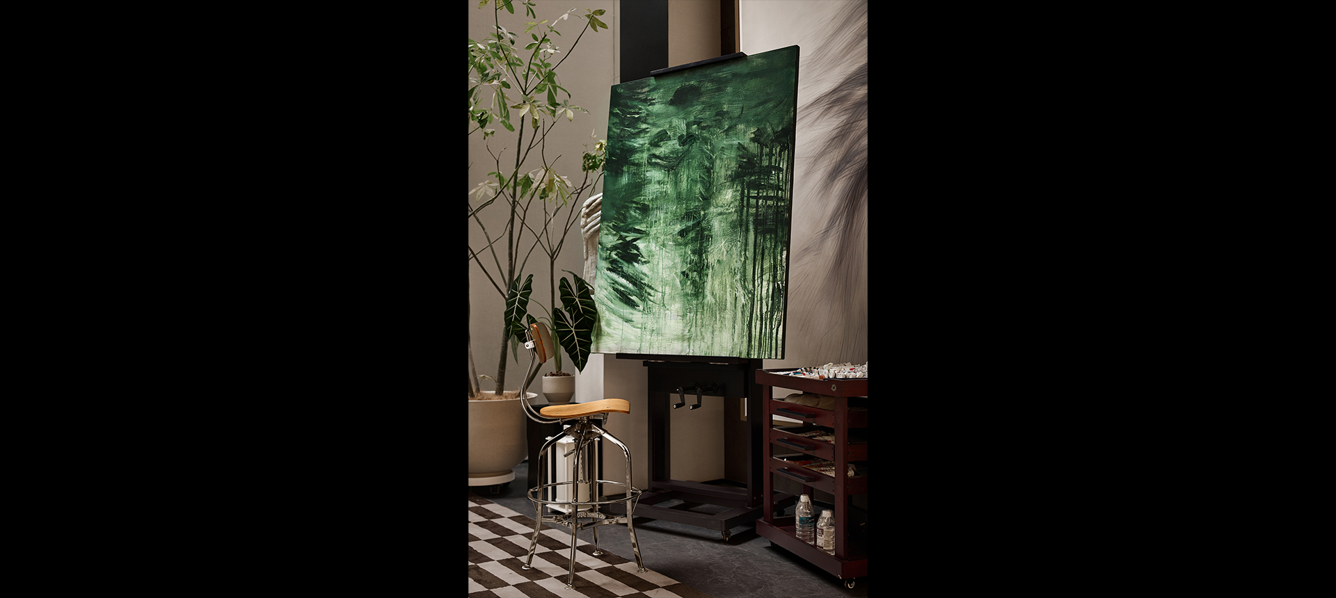 墙角的绿植如一片丰茂的小森林,各种形态的植物轻盈地垂挂。宽大的画桌上摆放着调色板、画笔,还有正在酝酿的画作。