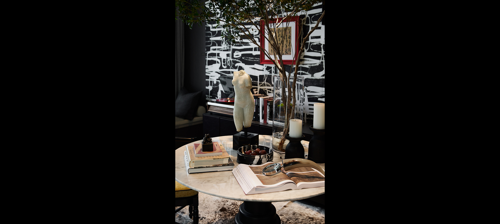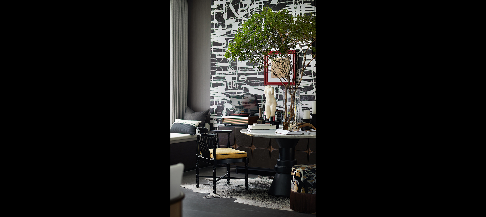 在艺术墙纸的映衬下
