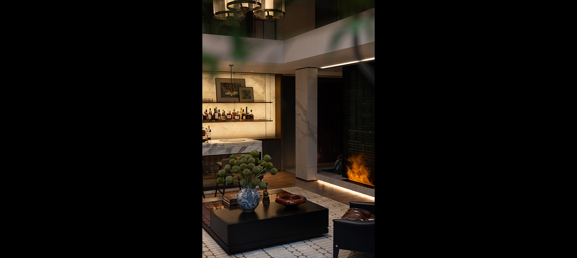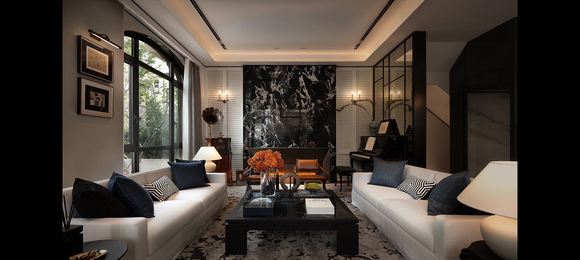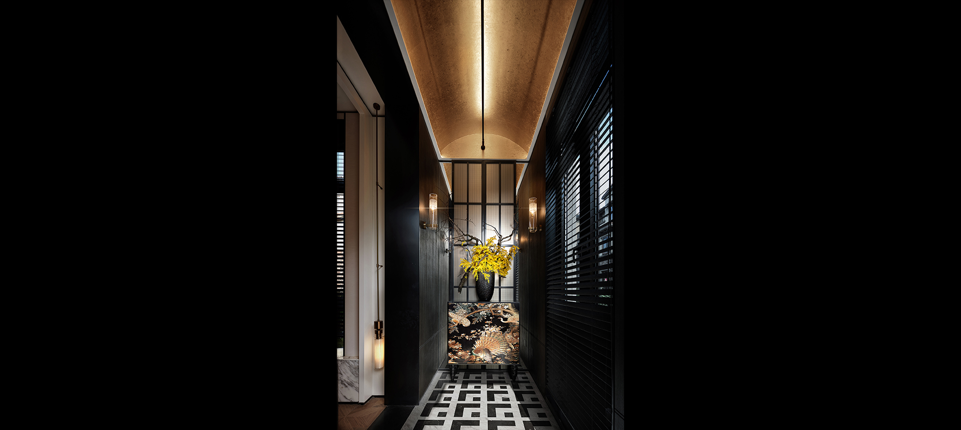 玄关作为室内的序曲,以其独具特色的精致奏响华丽的前章。天花以拱形造型贴合古铜金材料,醒目而绮丽。中式花艺及装饰感极强的古典艺术斗柜在玻璃屏风的衬托下,构成强烈的视觉冲击力。