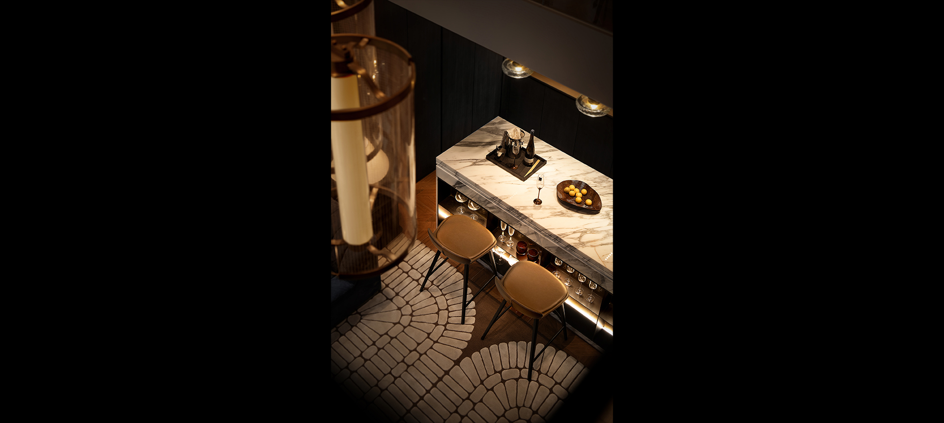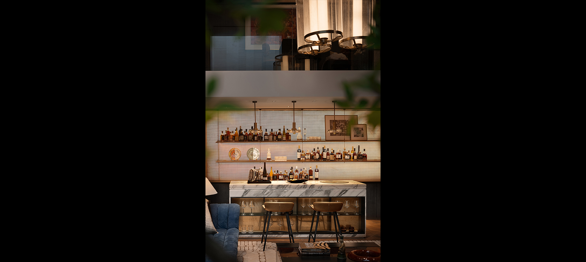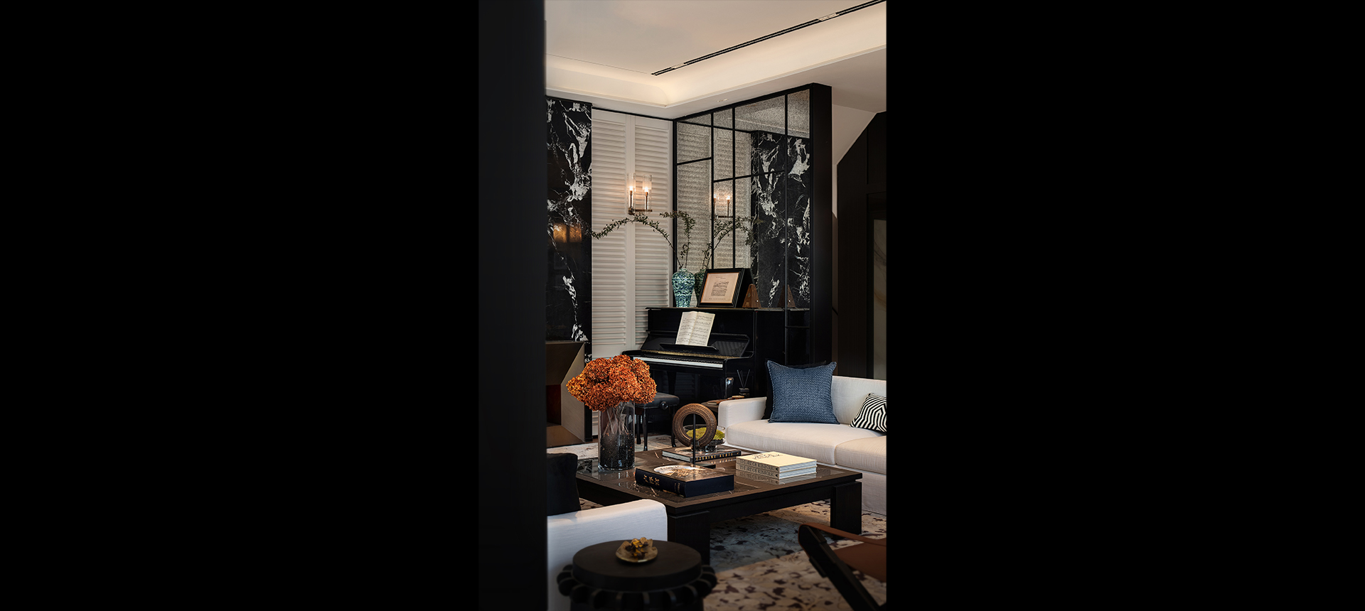 玄关作为室内的序曲,以其独具特色的精致奏响华丽的前章。天花以拱形造型贴合古铜金材料,醒目而绮丽。中式花艺及装饰感极强的古典艺术斗柜在玻璃屏风的衬托下,构成强烈的视觉冲击力。