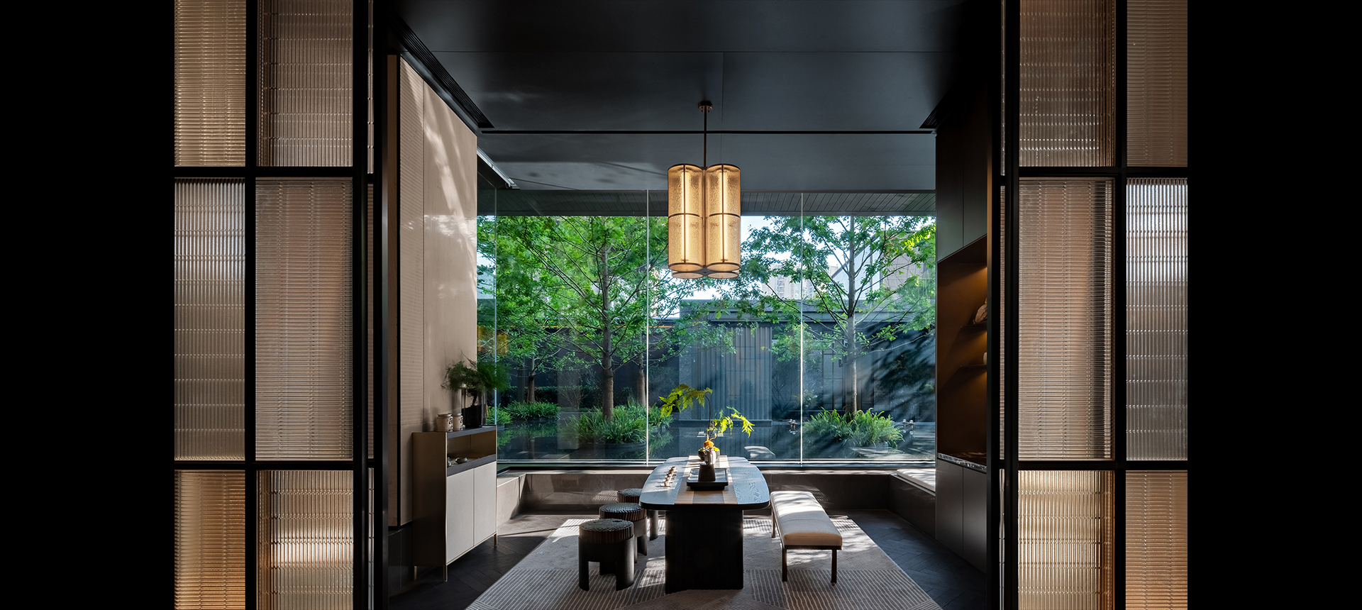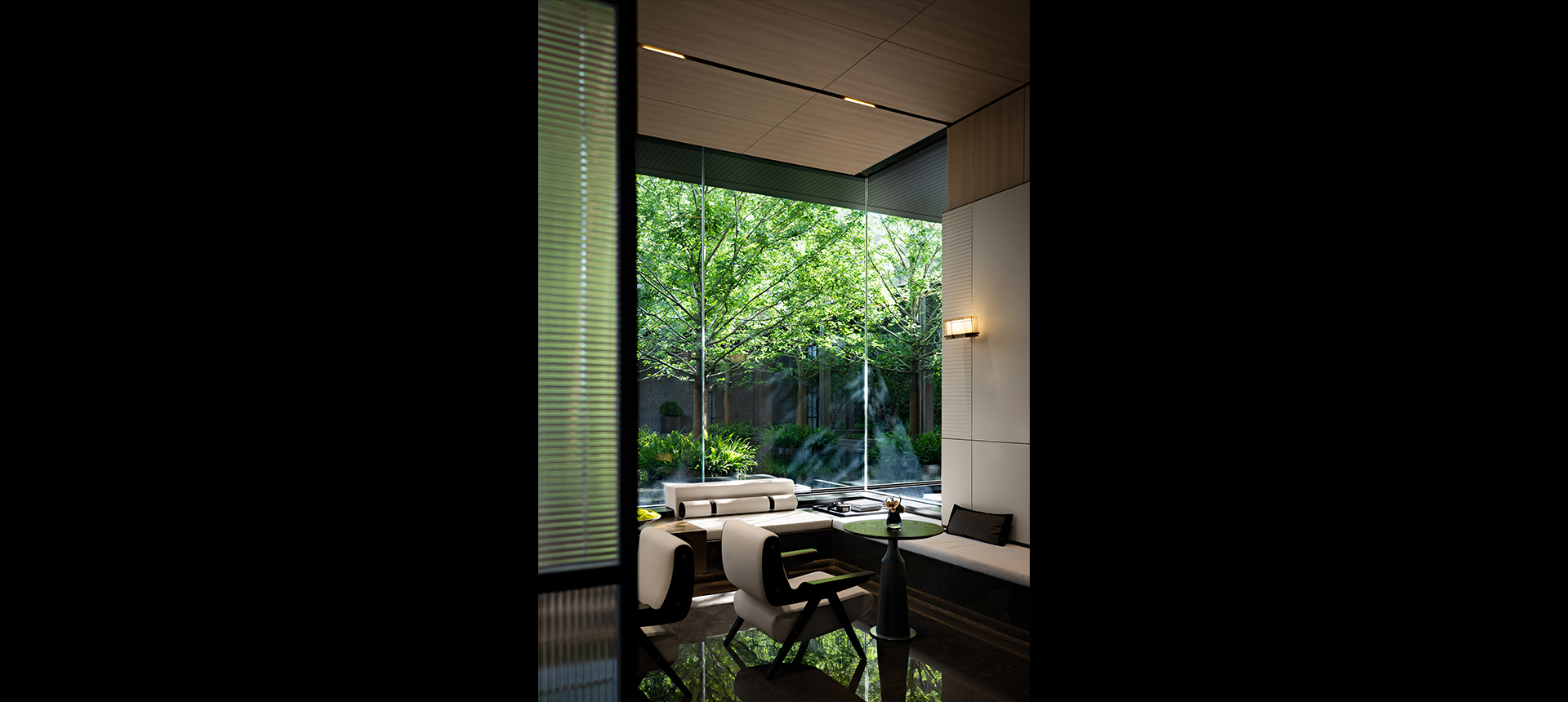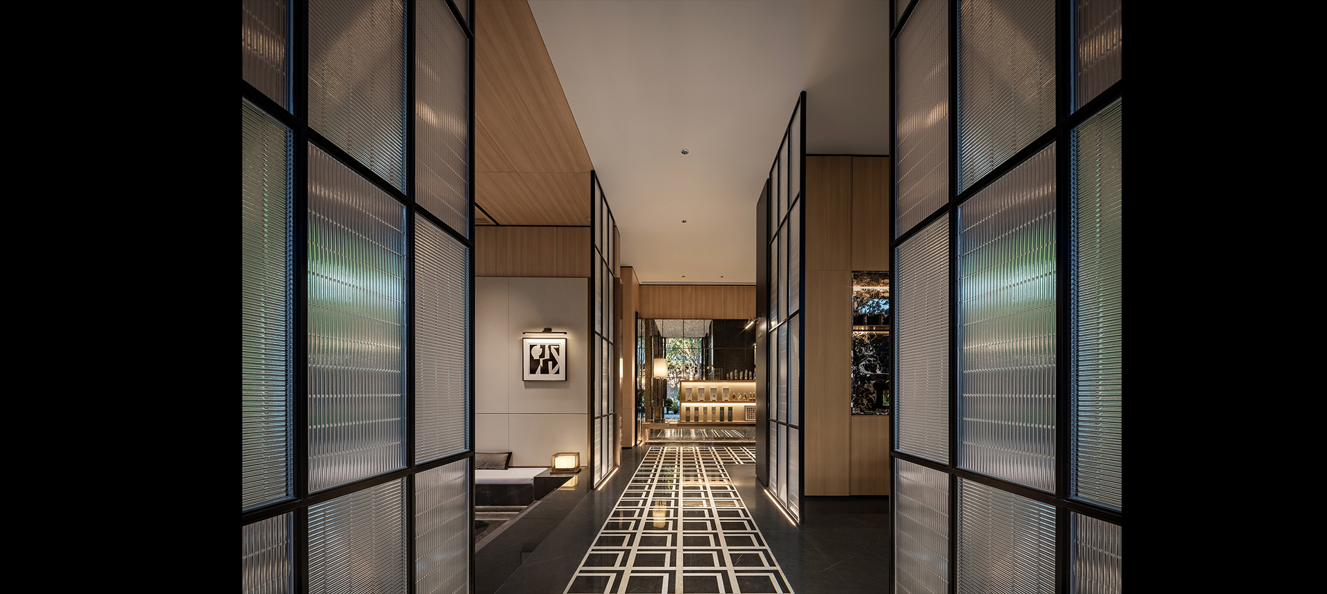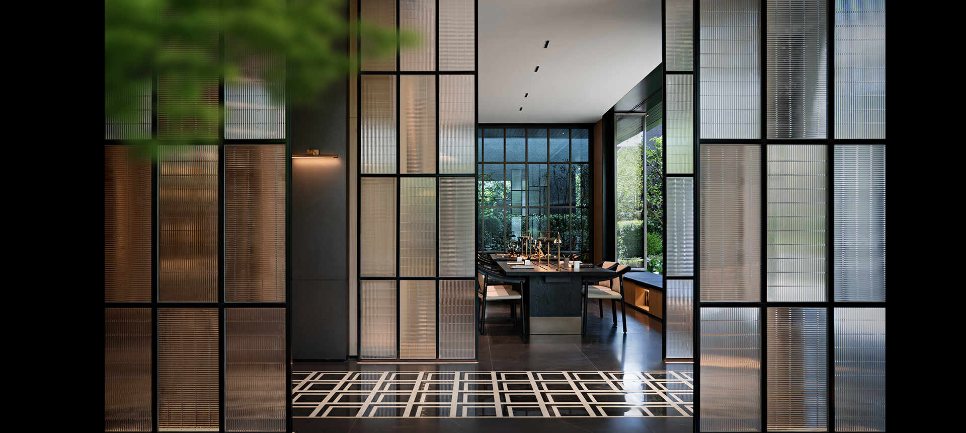 架空层的四周巧妙地运用了许多透明玻璃材质,使得室内空间与室外园林相互渗透,仿佛融为一体。而内部的空间划分也是采用艺术玻璃作软性分隔,不仅保持空间的通透性,且能增加一份独特的层次美感。