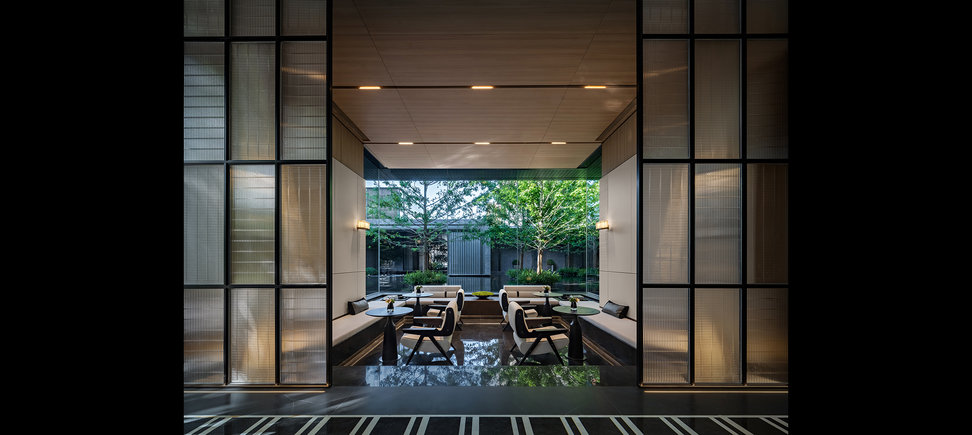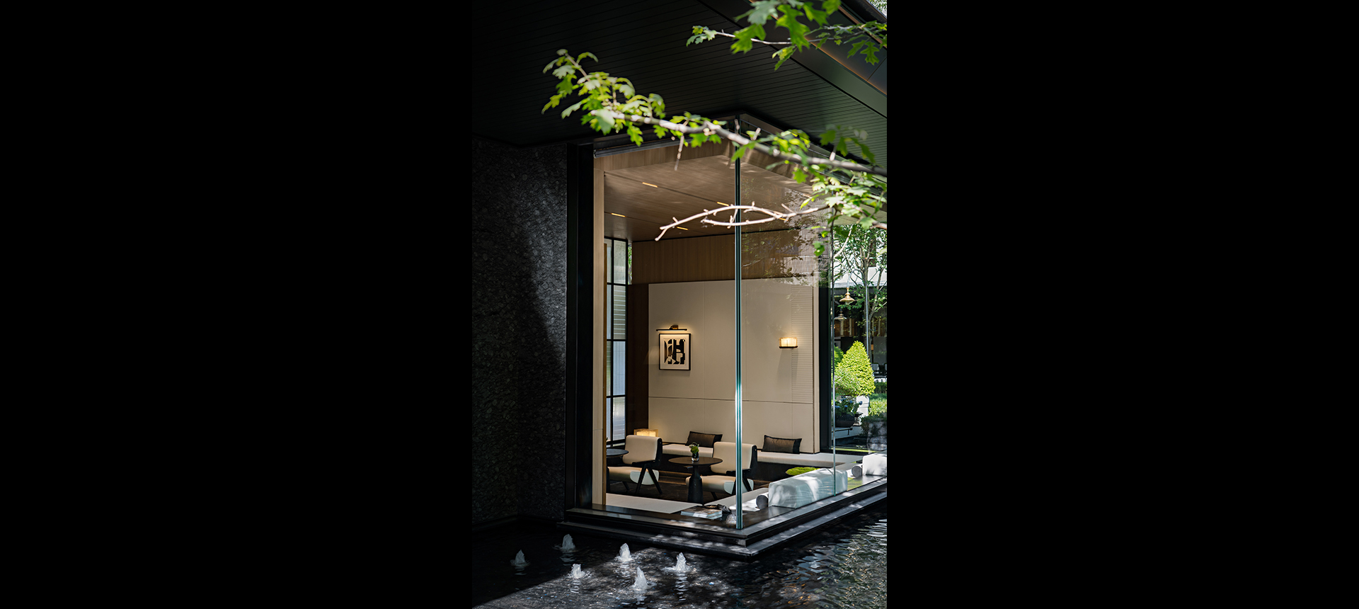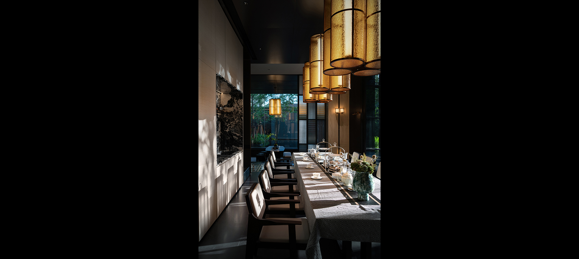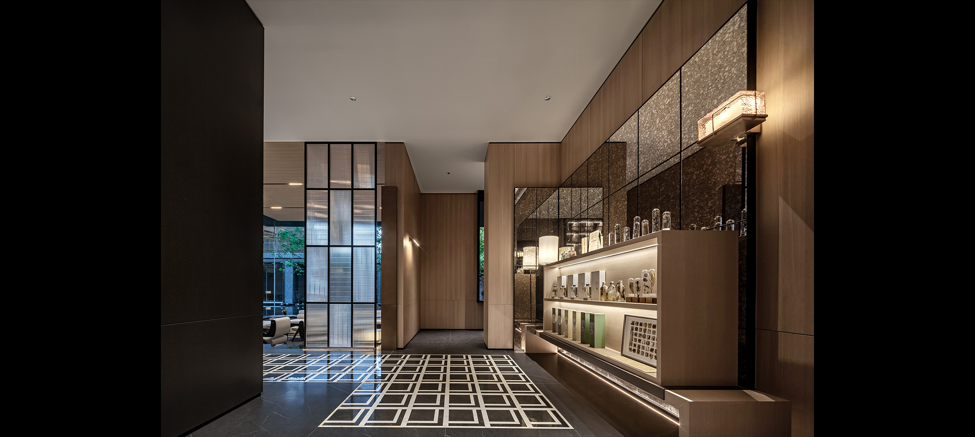 架空层的四周巧妙地运用了许多透明玻璃材质,使得室内空间与室外园林相互渗透,仿佛融为一体。而内部的空间划分也是采用艺术玻璃作软性分隔,不仅保持空间的通透性,且能增加一份独特的层次美感。