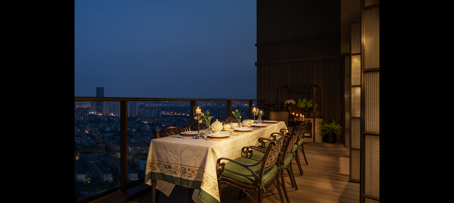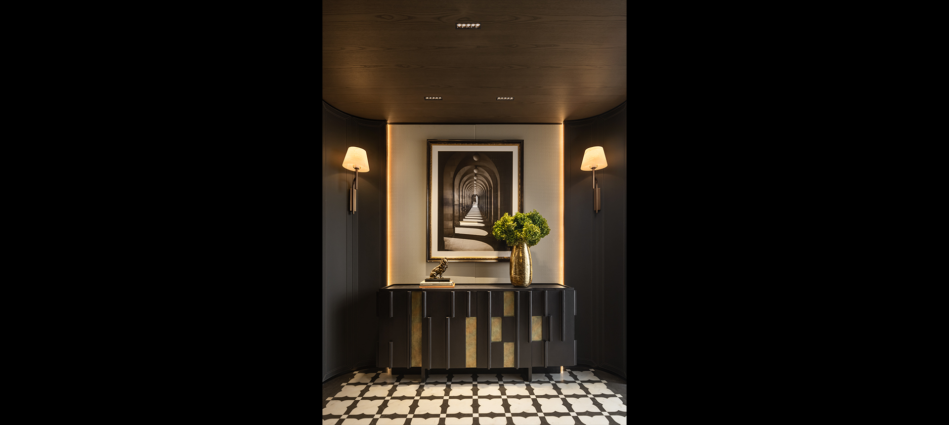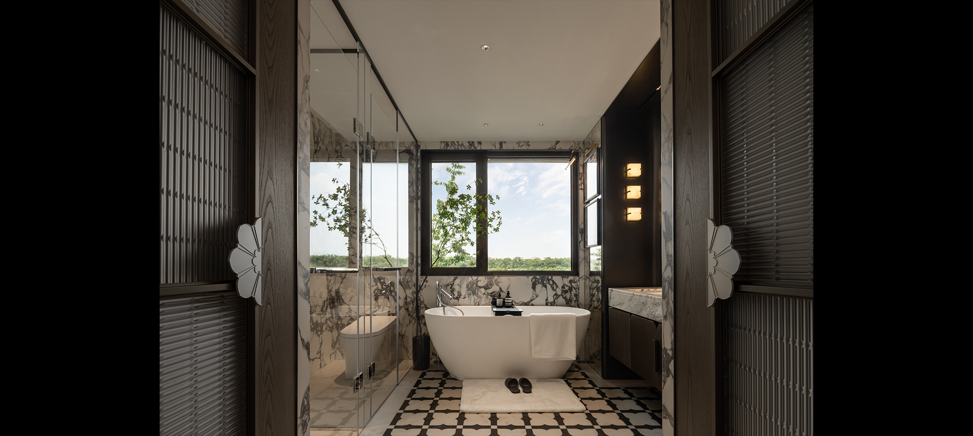 室内设计风格流露现代的“繁花”气韵,从色调的选择到家具的搭配,从装饰品的摆放到细节的处理,每一处都呈现了一种典雅、优雅、华丽的气质。设计师将宝相花的图形提取演变为现代室内装饰可使用的元素,既贴合项目地西安的文化传统,也为空间创作了独有的标签。